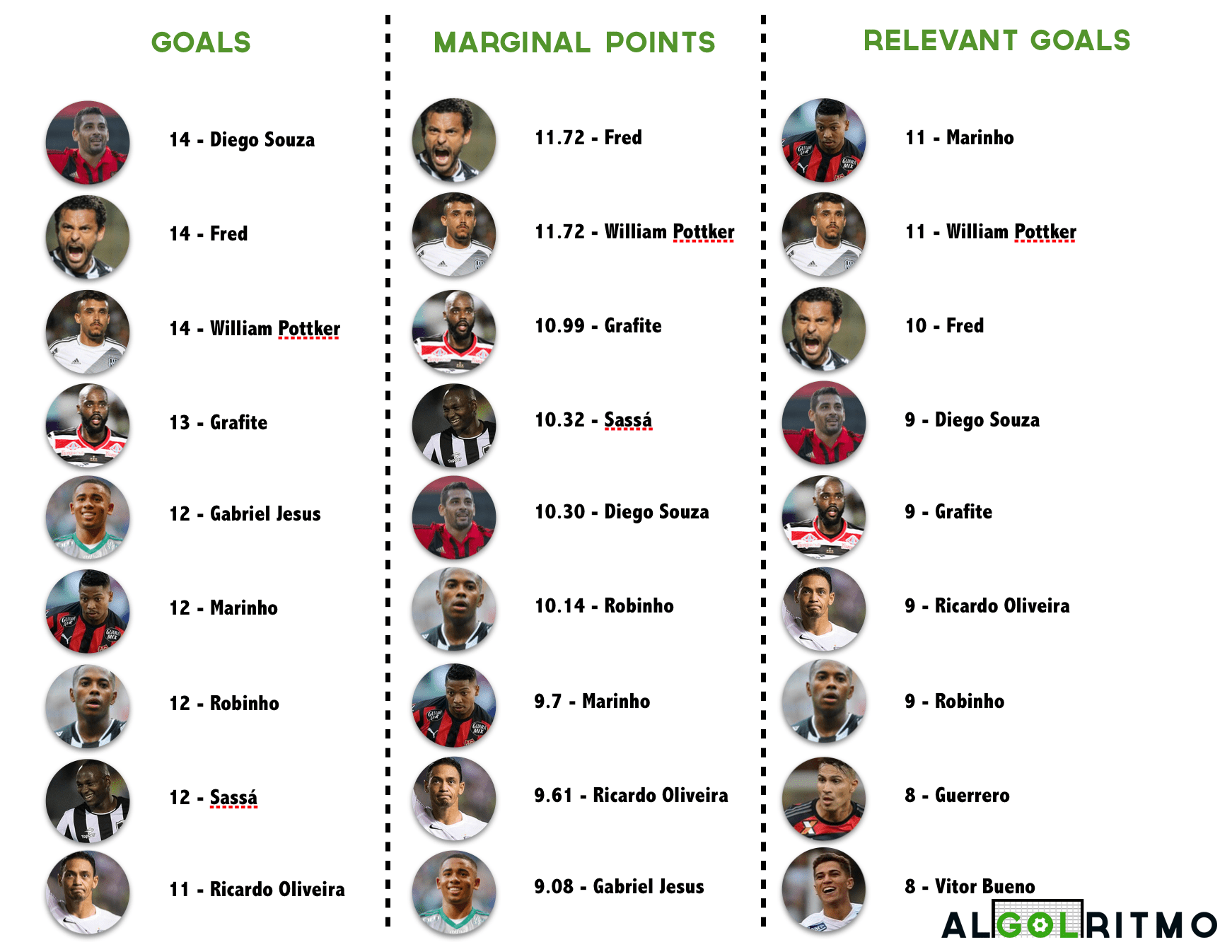 It is possible to see that many names are present in all three lists, but their rankings vary. All of them are interesting and talented players, however it is important to understand some of their differences. A good illustration of those differences is a comparison between Sassá (who plays for Botafogo) and Marinho (who plays for Vitória), both players ended up tied with 12 goals in the conventional top scorers list.