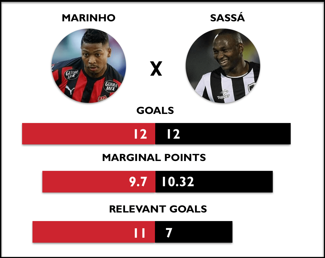 Sassá scored 7 relevant goals and produced 10.32 marginal points, while Marinho scored 11 relevant goals and produced 9.7 marginal points. It is possible to say that in this tournament Sassá’s goals mostly helped enlarge Botafogo’s wins, since many of his goals changed to score to 2 x 0 or 3 x 0. On the other hand, most of Marinho’s goals changed the perspective of matches for Vitória and were essential in keeping the team in the first division. Therefore, both players had an important role in guaranteeing points for their teams, yet Marinho’s goals happened at tighter moments of the game.