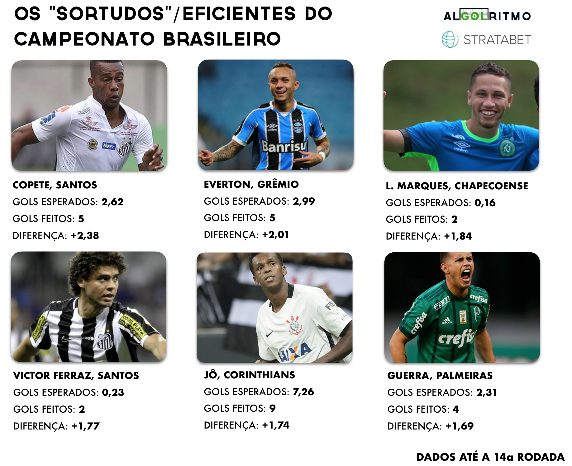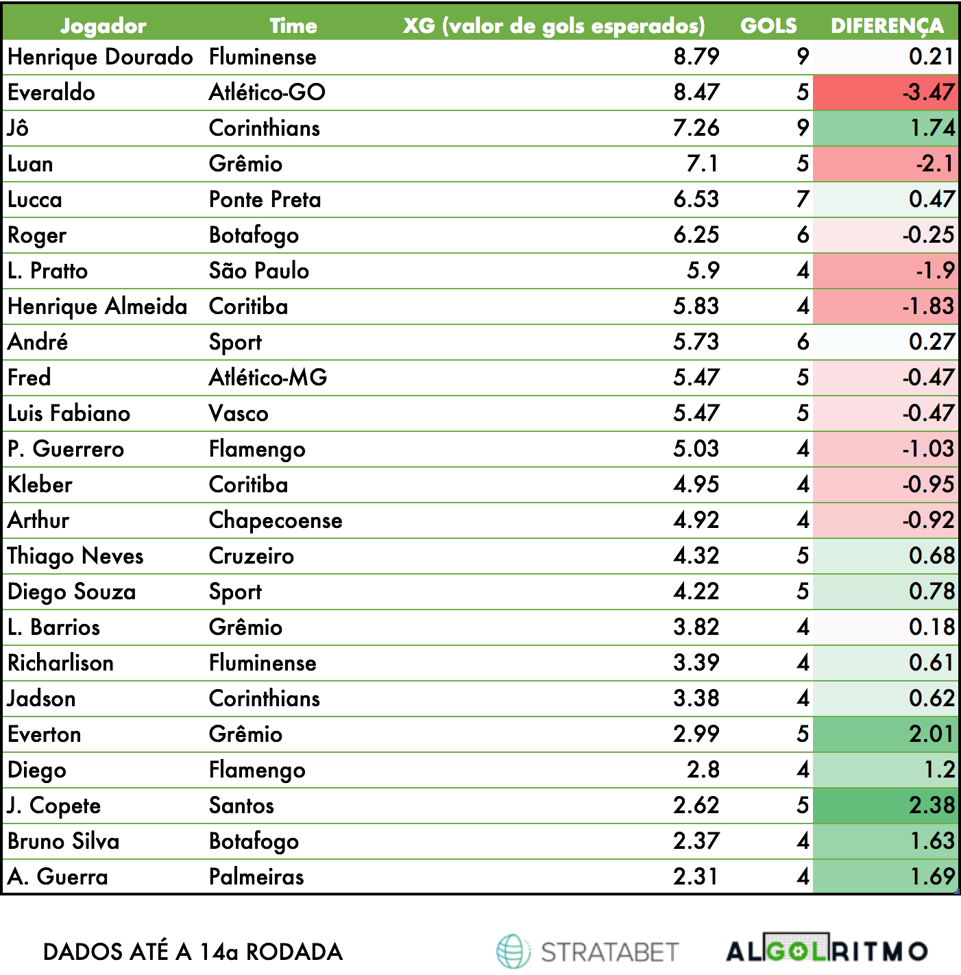 Os jogadores presentes no quadro acima possuem o número de gols maior que o seu xG, pode-se dizer que esses estão fazendo mais gols do que esperado de acordo com suas finalizações e oportunidades. Novamente, a diferença entre o número de gols e o xG pode ser entendida de 2 formas. Por um lado, é possível enxergar esses jogadores como “sortudos”, fazendo gols improváveis e com atuações nas quais tudo parece dar incrivelmente certo. Por outro lado, pode-se dizer que os números desses jogadores não estão relacionados a sorte e sim a eficiência e competência. De acordo com essa teoria, atacantes como Copete, Everton e Jô conseguem ser cirúrgicos e transformar um grande número de suas finalizações em gol.