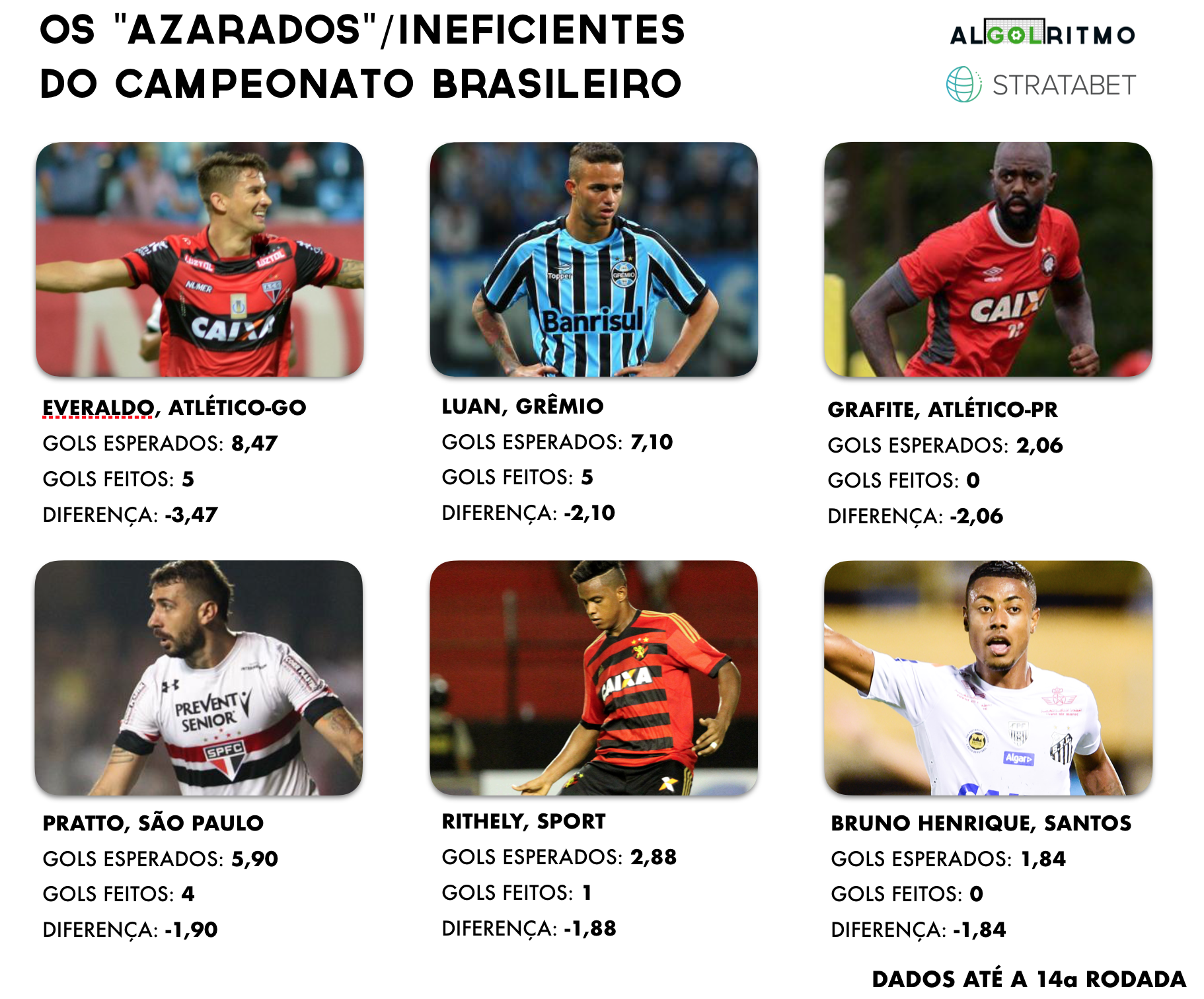 A imagem acima traz os jogadores que possuem a maior diferença entre o xG (valor esperado de gols) e a quantidade de gols feitos, portanto, estão fazendo menos gols do que o esperado. Essa diferença entre o xG e o número de gols pode ser compreendida de 2 maneiras distintas. A primeira é que esses jogadores simplesmente estão vivendo um período de “azar”. Eles finalizam diversas vezes e criam boas oportunidades, mas as vezes a bola simplesmente não entra. A segunda visão possível é que eles têm sido ineficientes. Pode-se entender que jogadores como Pratto, Luan e Everaldo, mesmo figurando entre os artilheiros do campeonato, estão desperdiçando chances demais e “devendo” em termos de gols.