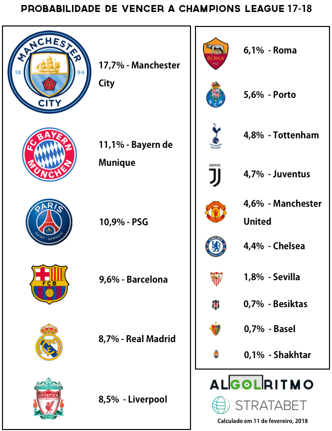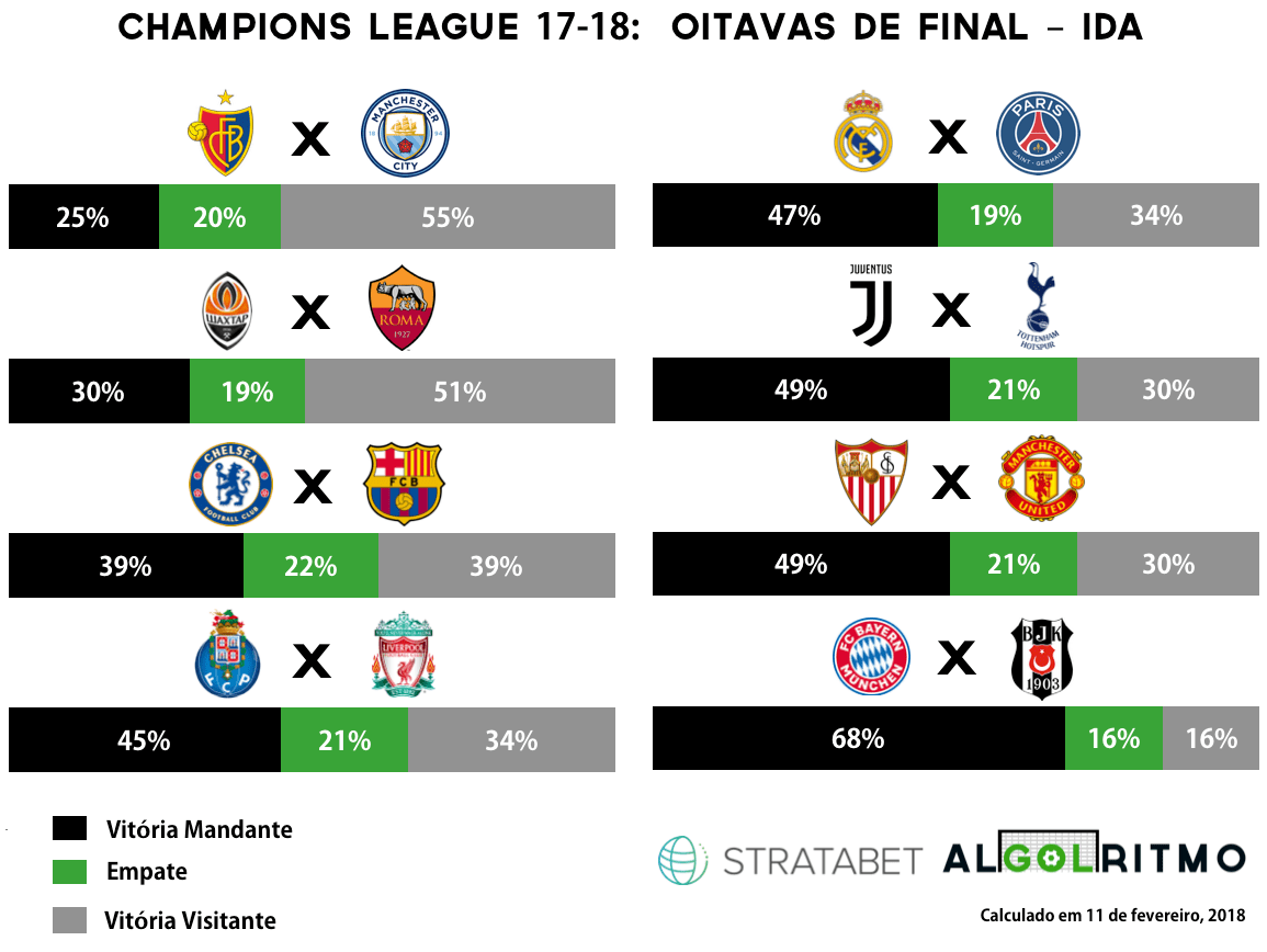 O Algolritmo está de volta com previsões sobre a UEFA Champions League, que inicia sua fase mata-mata amanhã. Utilizando os excelentes dados providenciados pela Stratabet, calculei as probabilidades de cada time ser campeão do torneio mais disputado da Europa, assim como as probabilidades de vitória, empate ou derrota dos confrontos de ida das oitavas de final. Pretendo ao longo das próximas fases do campeonato publicar mais textos com novas previsões. Primeiro apresento duas imagens e uma análise que resumem os resultados da simulação. Após isso detalho o método utilizado para os leitores que tem interesse em estatística, matemática e computação (além de futebol, é claro).