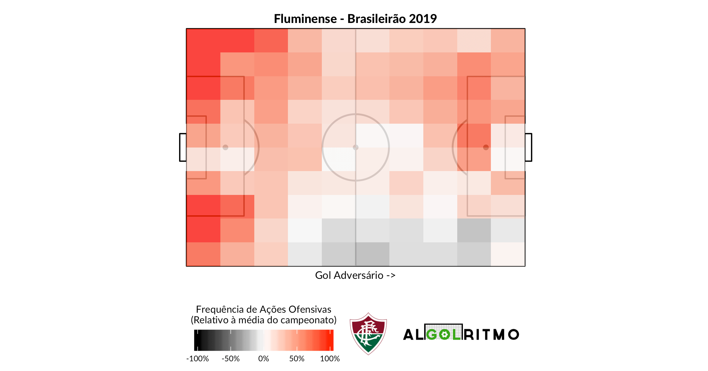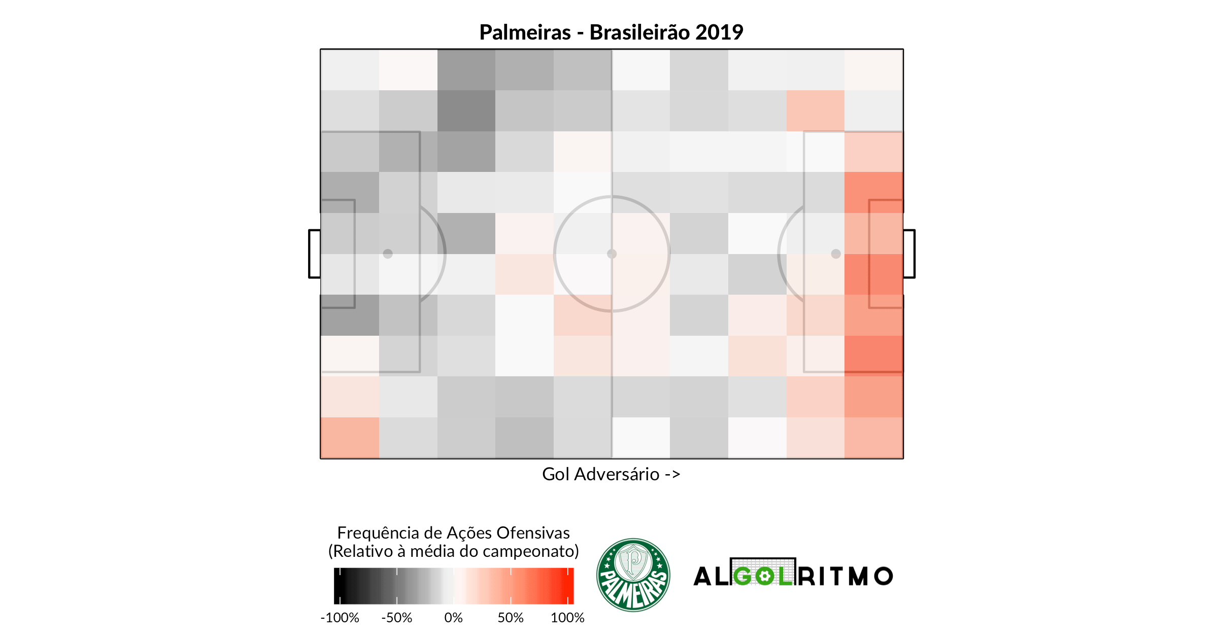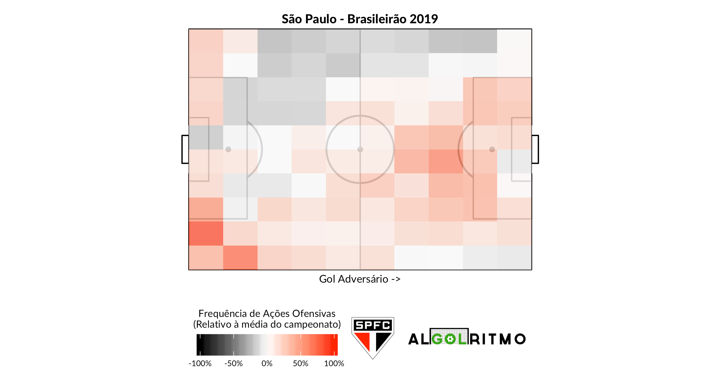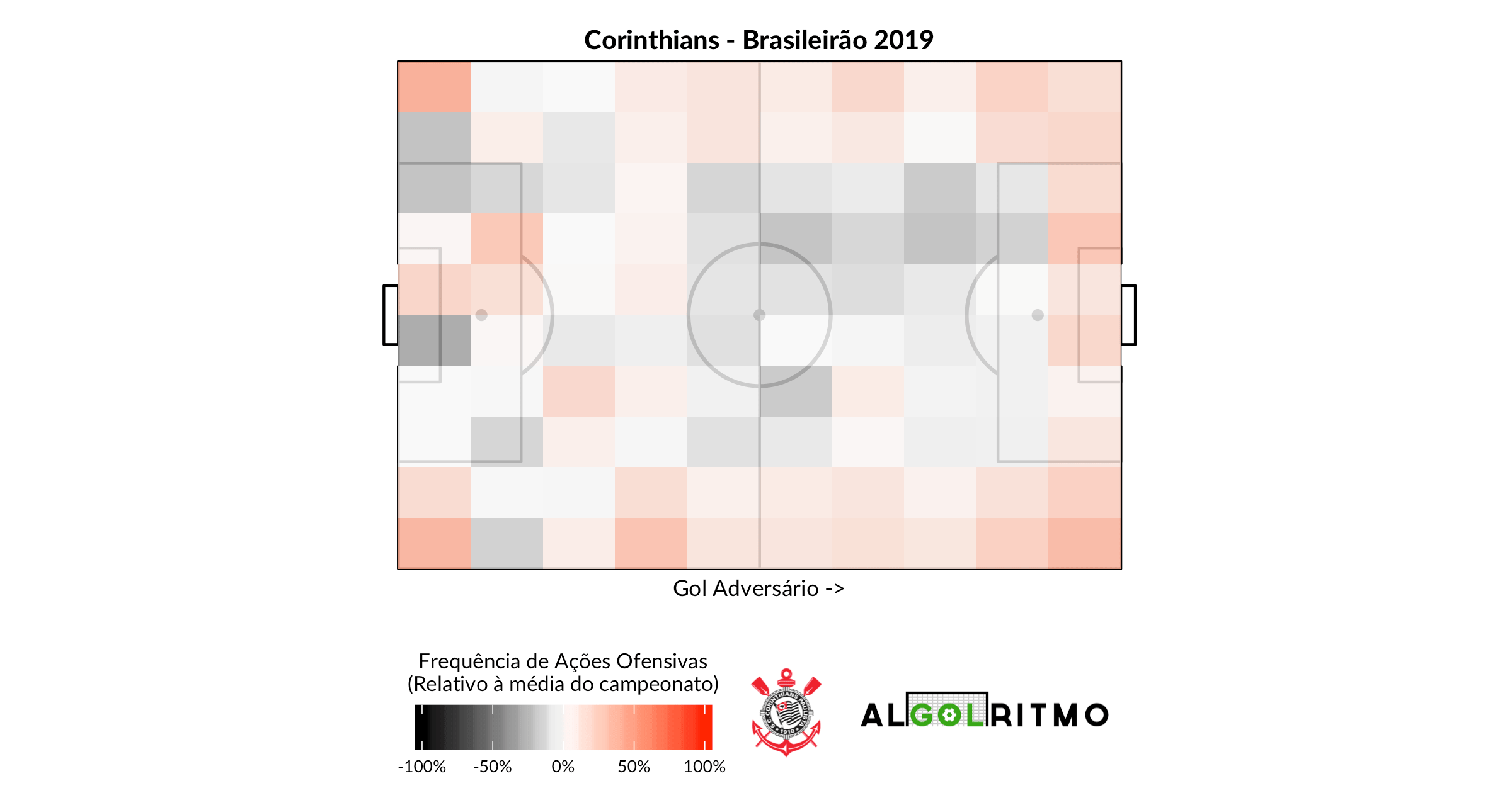 É importante ressaltar que os mapas de calor acima foram normalizados em relação à média do campeonato. Em outras palavras, se uma equipe tem uma mancha vermelha em algum setor ele tem mais a bola naquele local comparado aos outros times do campeonato. Similarmente, uma mancha preta mostra que a equipe tem menos a bola comparado aos outros times. Normalizar os mapas de calor é importante pois ajuda a entender a real diferença entre as equipes do campeonato.
