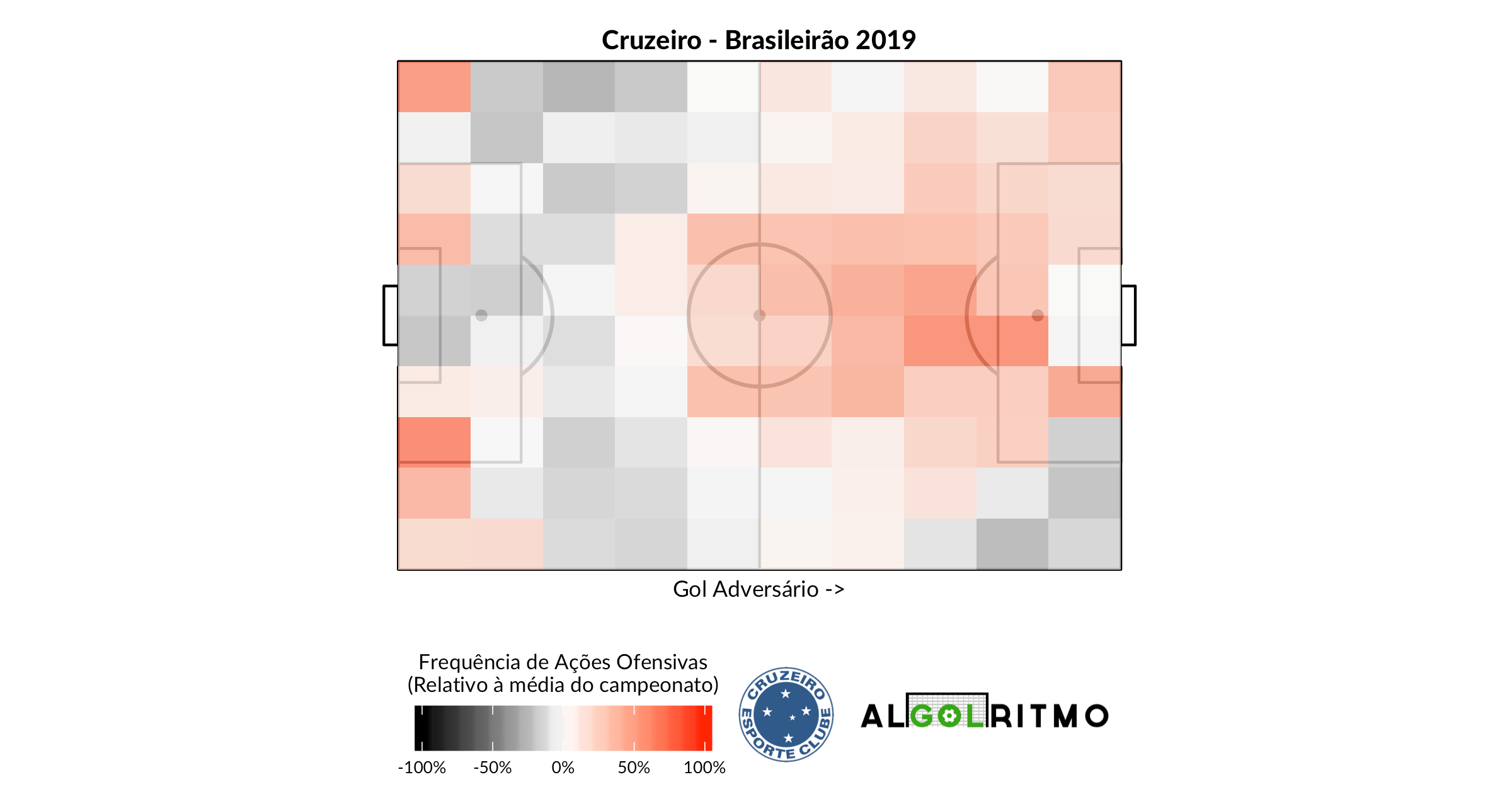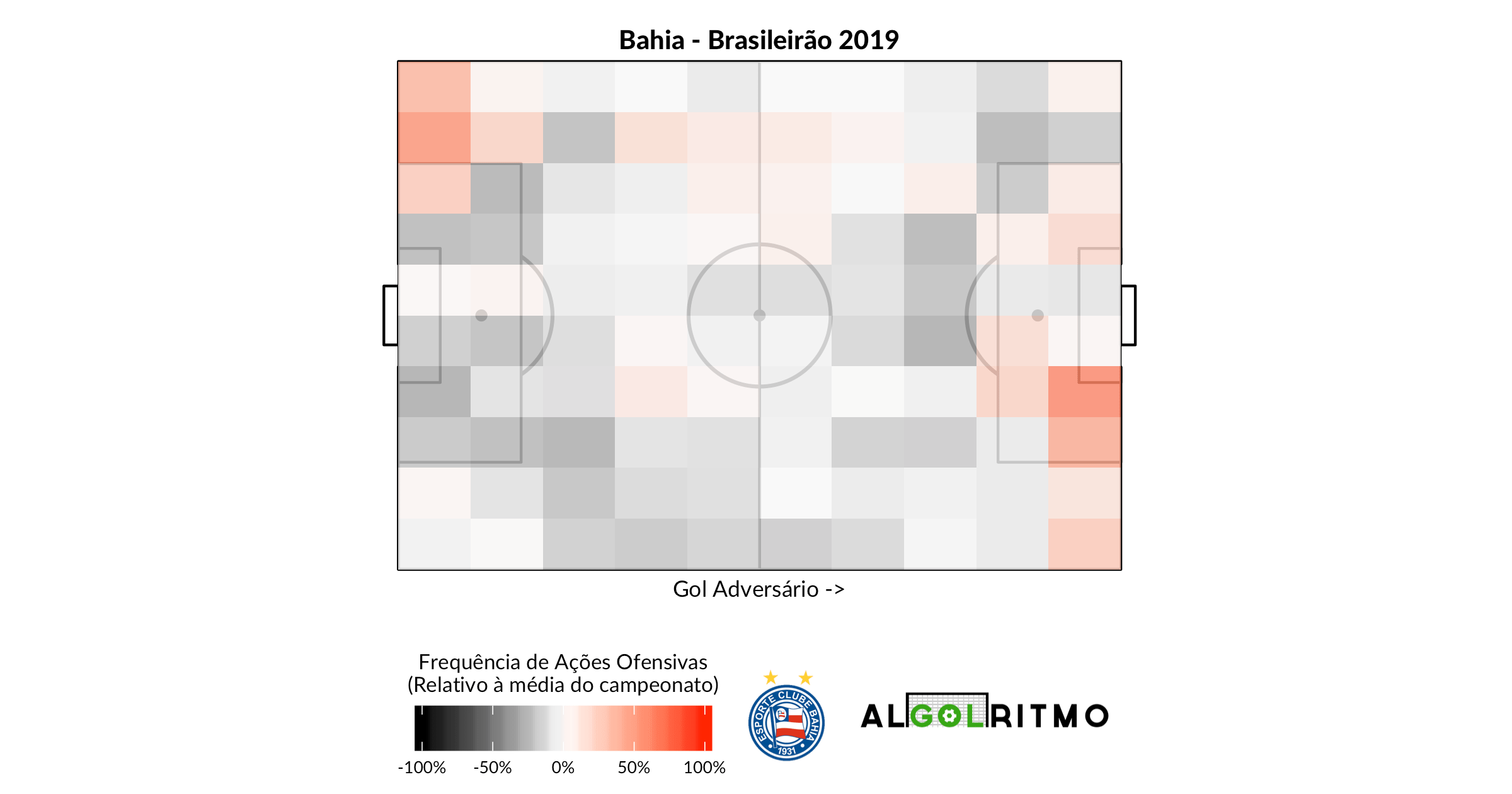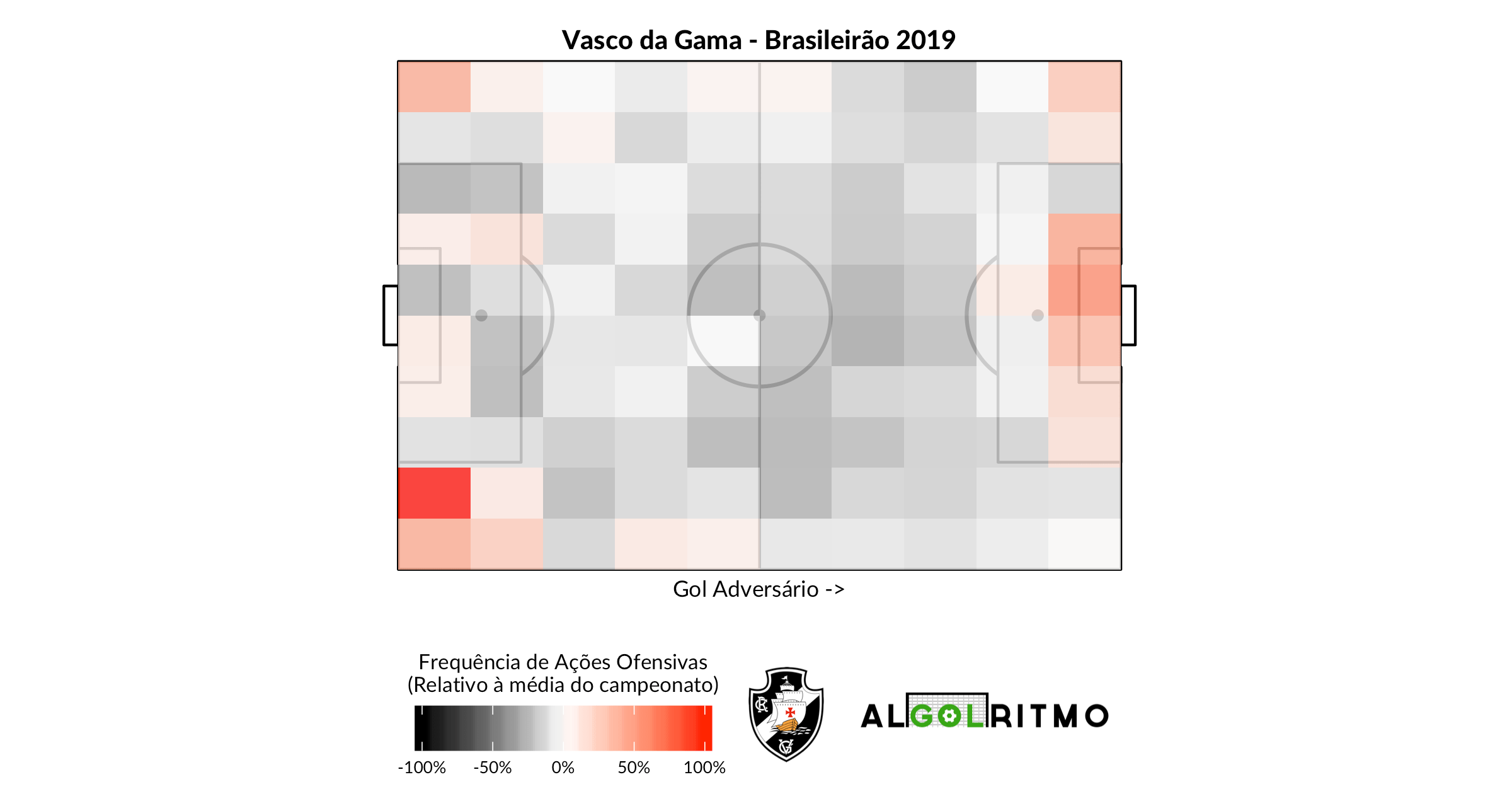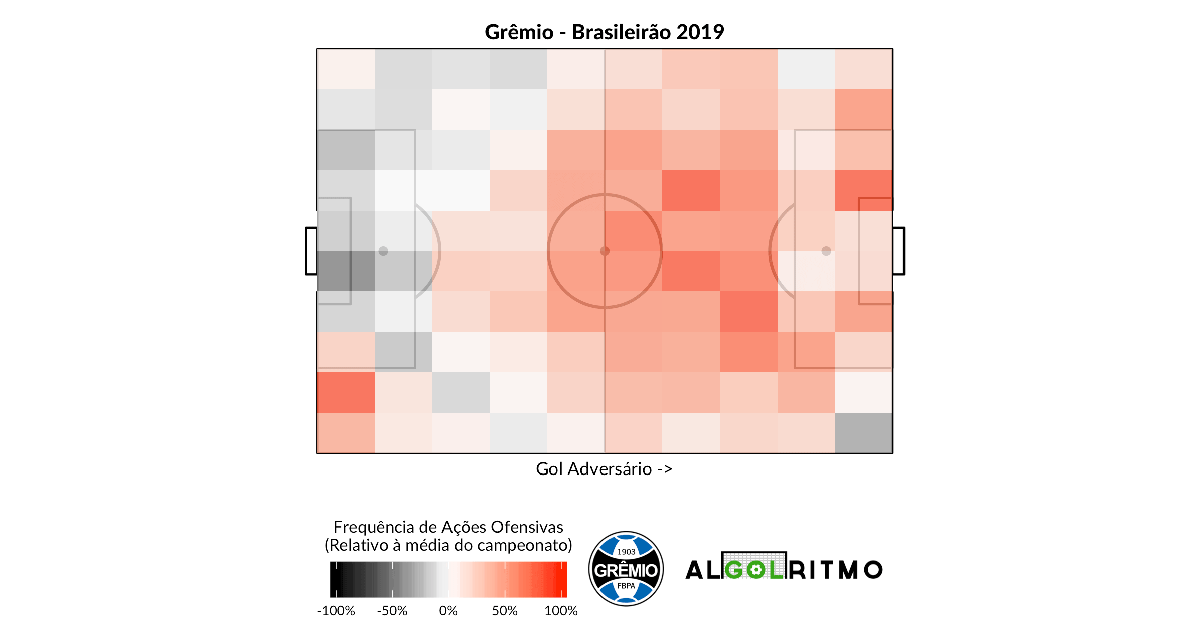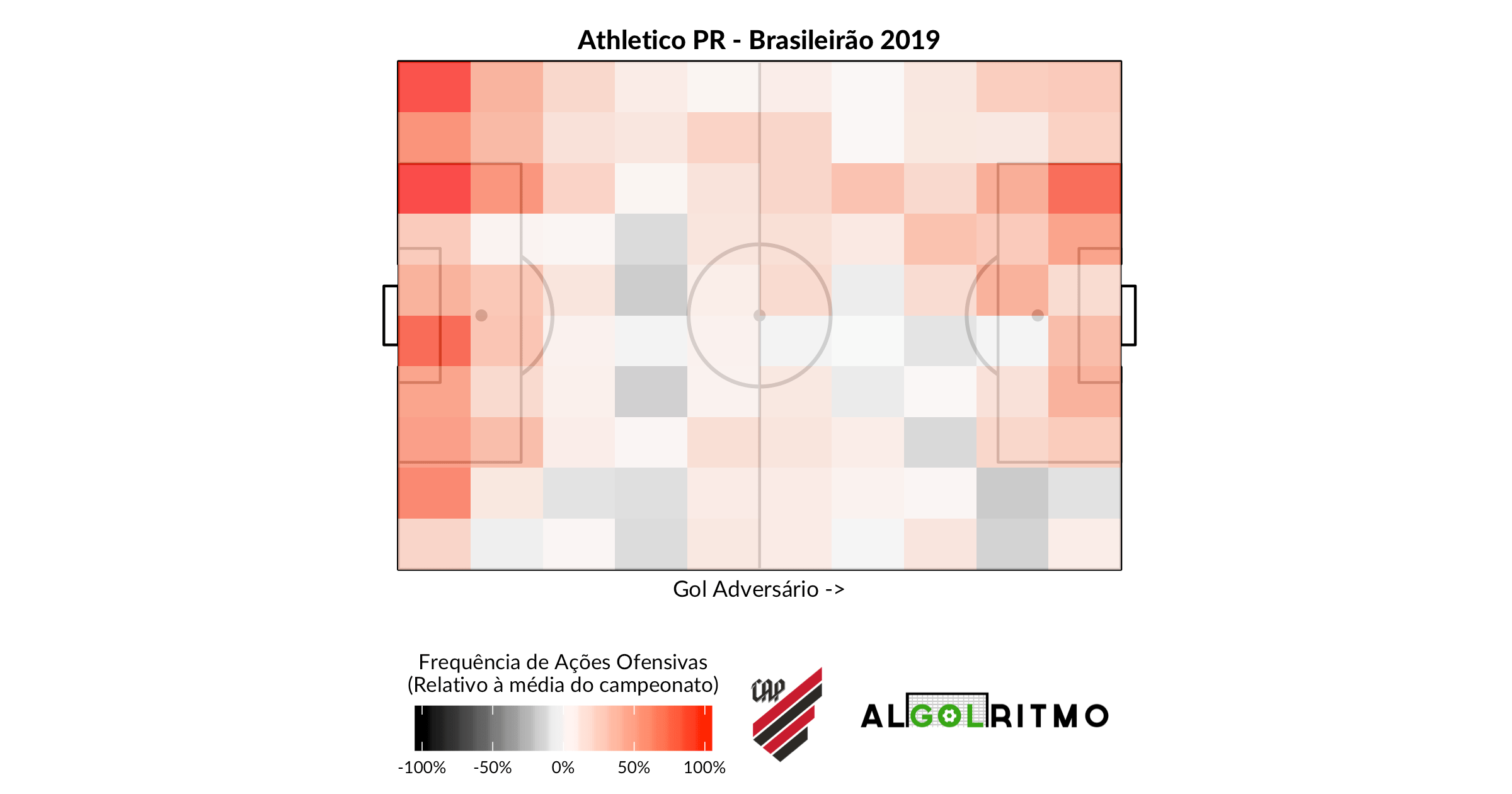 É importante ressaltar que os mapas de calor acima foram normalizados em relação à média do campeonato. Em outras palavras, se uma equipe tem uma mancha vermelha em algum setor ele tem mais a bola naquele local comparado aos outros times do campeonato. Similarmente, uma mancha preta mostra que a equipe tem menos a bola comparado aos outros times. Normalizar os mapas de calor é importante pois ajuda a entender a real diferença entre as equipes do campeonato.