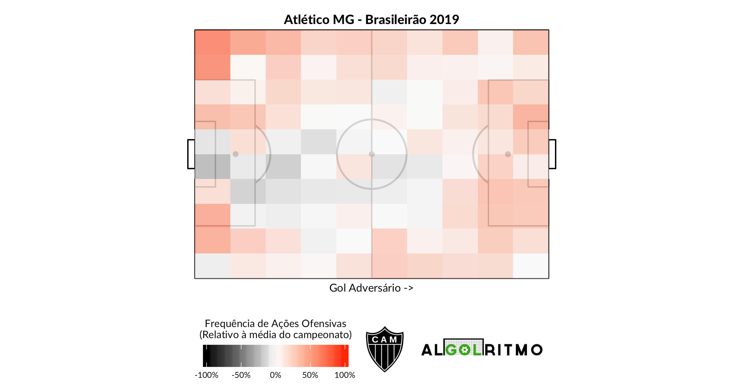 O Atlético tende a buscar mais as laterais, e ultimamente tem explorado lançamentos para Otero e Di Santo. O time consegue ter a bola dentro da área mais do que a média dos times do Brasileirão, mas não transforma essa posse de bola em muitas oportunidades de qualidade.