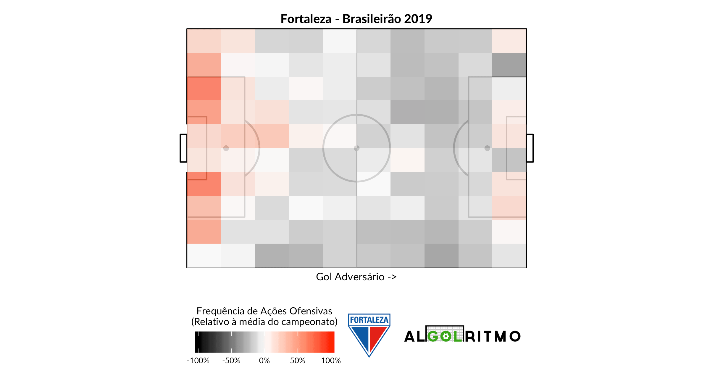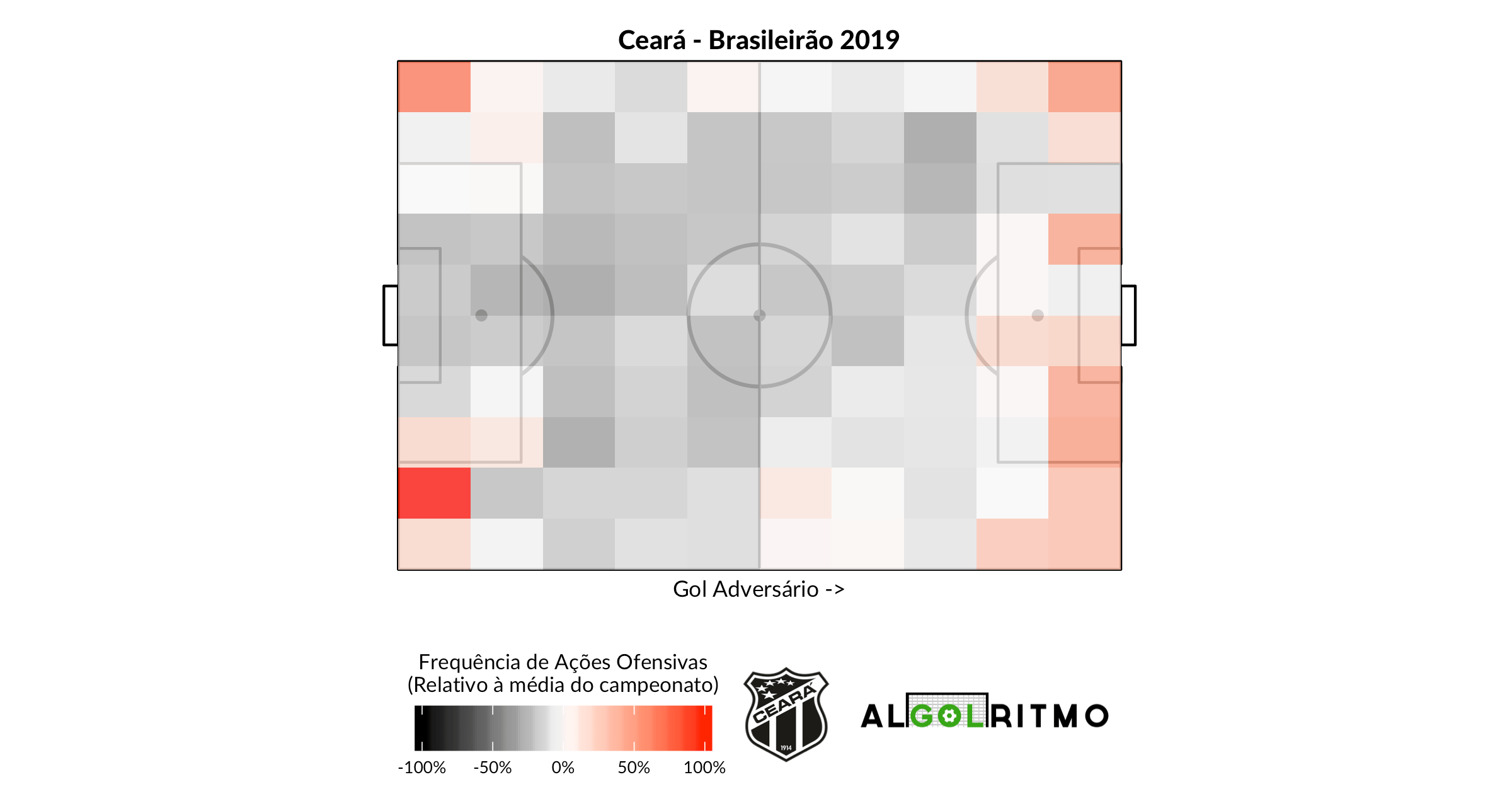 O Ceará é um time interessante. É um dos times que mais finaliza no Brasileirão mas não troca muitos passes para construir suas jogadas. Note também as manchas vermelhas próximas aos cantos de aos cantos do campo. O time tem muitos escanteios