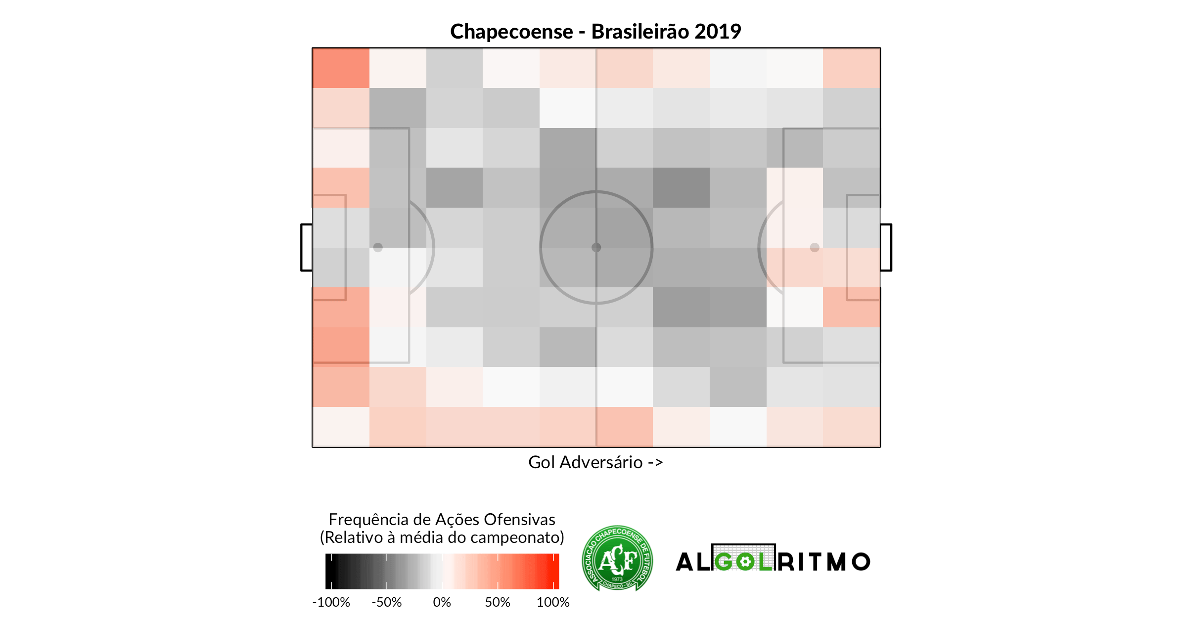 A Chapecoense não consegue ter a bola no meio campo, e busca explorar a posse de bola pelo lado direito em muitos momentos. Além disso, podemos a influência de Everaldo (destaque ofensivo do time) com a mancha vermelha dentro da área