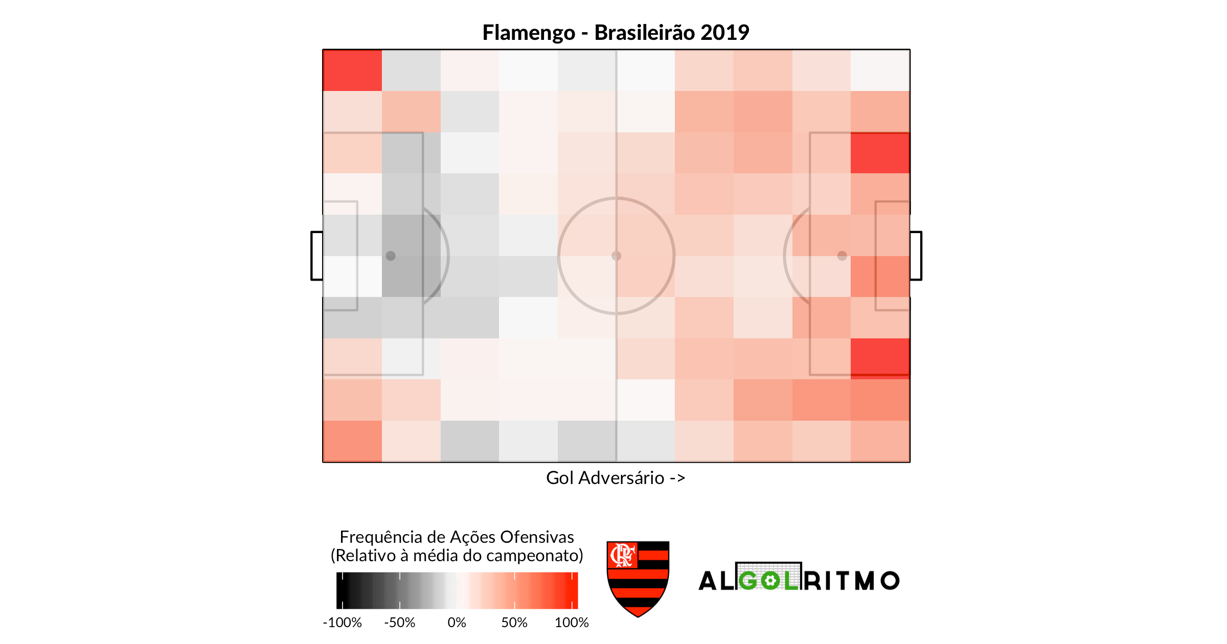 O Flamengo é o time mais intenso no ataque nesse Brasileirão. Time está sempre presente e agredindo no campo adversário. É interessante ver que o time tem dois quadrantes muito “quentes” e perigosas dentro da área adversária onde muitas oportunidades são criadas.
