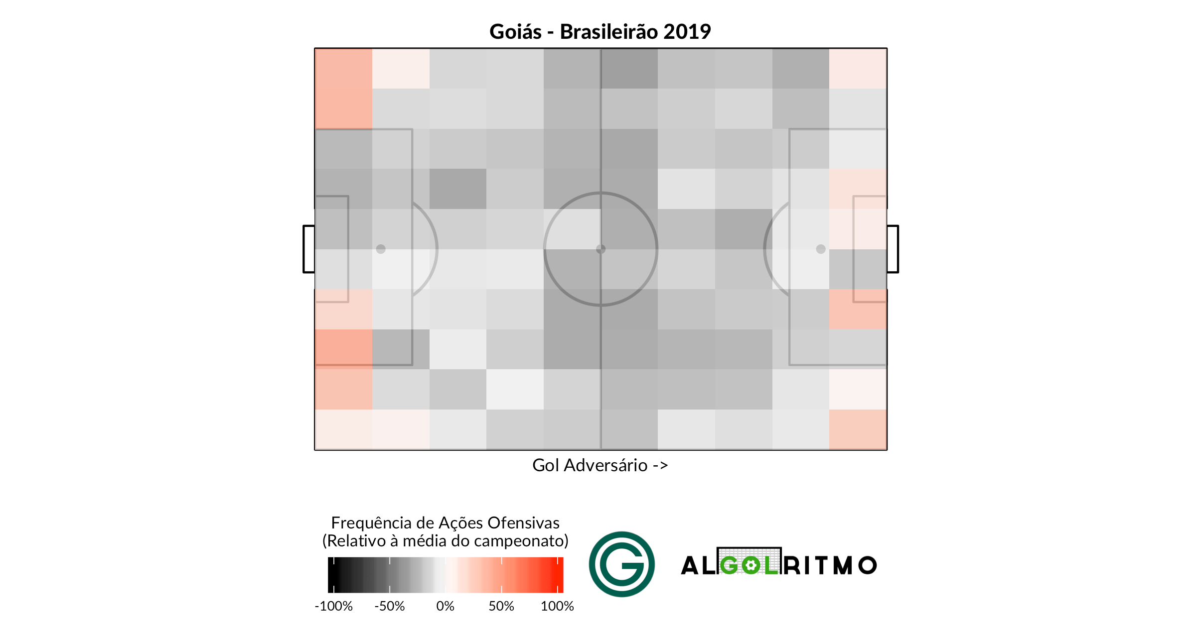 O Goiás talvez seja um dos principais exemplos de jogo direto (praticado por muitos times nesse campeonato). O time não busca ter a bola e trabalhar jogadas, ilustrado pela grande mancha cinza no mapa de calor. A ideia do Goiás é concluir as jogadas rapidamente.