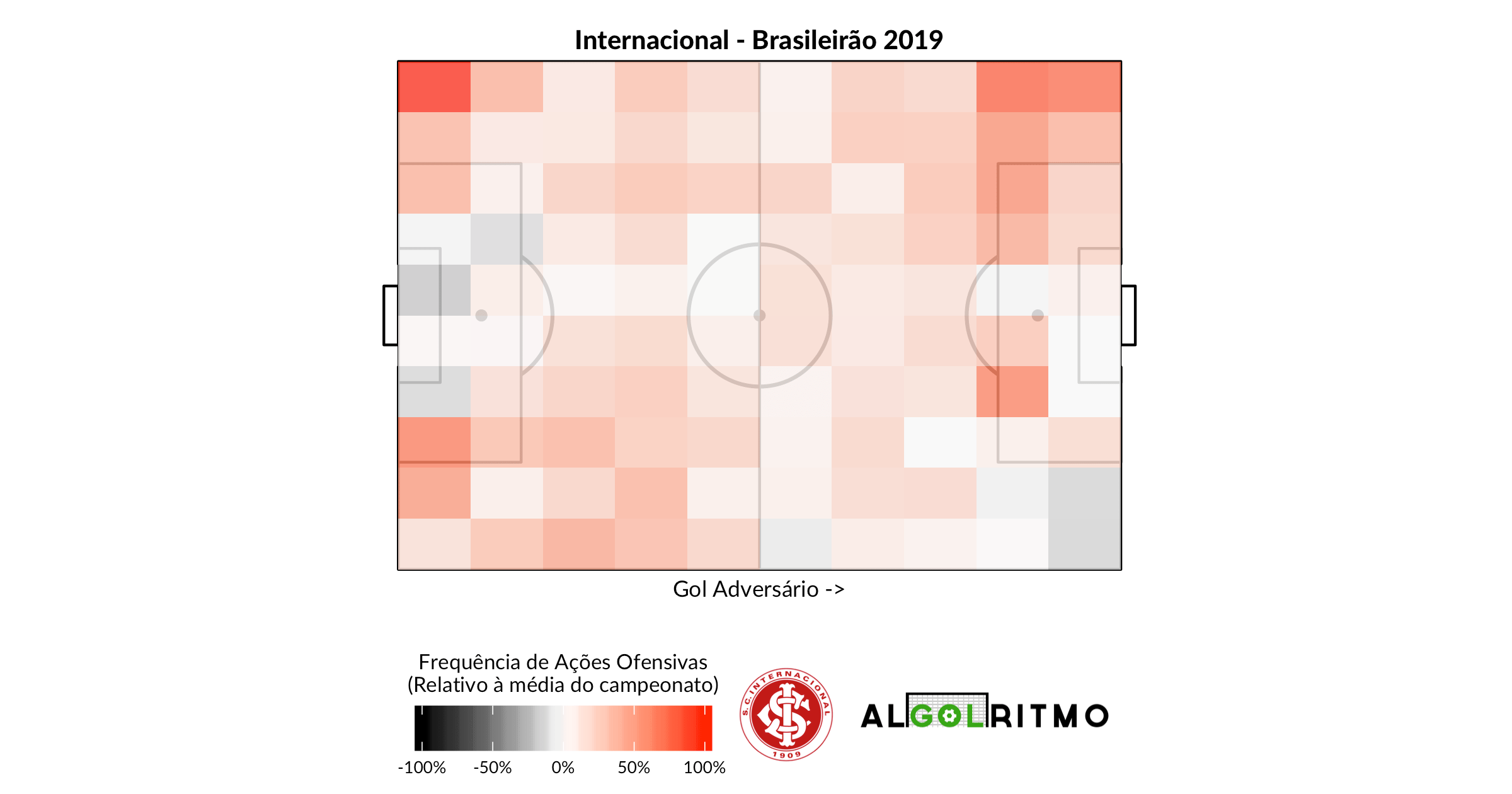 O Internacional ataca mais pela esquerdo, onde Patrick geralmente está presente. No geral, o time tem a bola um pouco mais do que a média no campeonato. Dentro da área vemos algumas fortes manchas vermelhas por conta da participação de Guerrero e infiltrações de Edenílson.