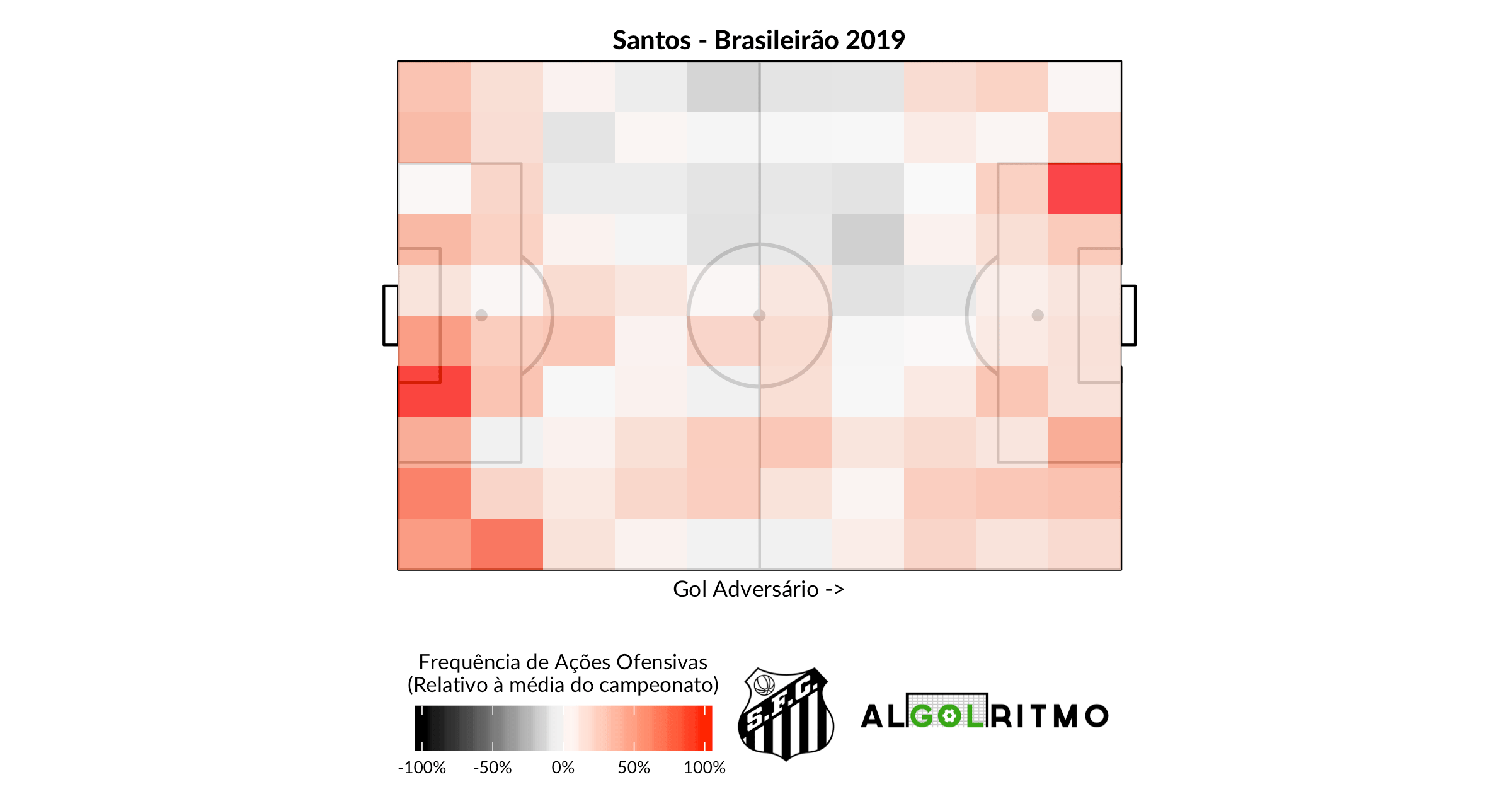 O Santos trabalha a bola mais pelo lado direito (comparado à média do campeonato), onde atua Sánchez. O uruguaio é um dos principais criadores do time e muitas vezes é um imã para a bola. Na ponta esquerda, vemos um zona quente, “incendiada” pelas participações de Soteldo