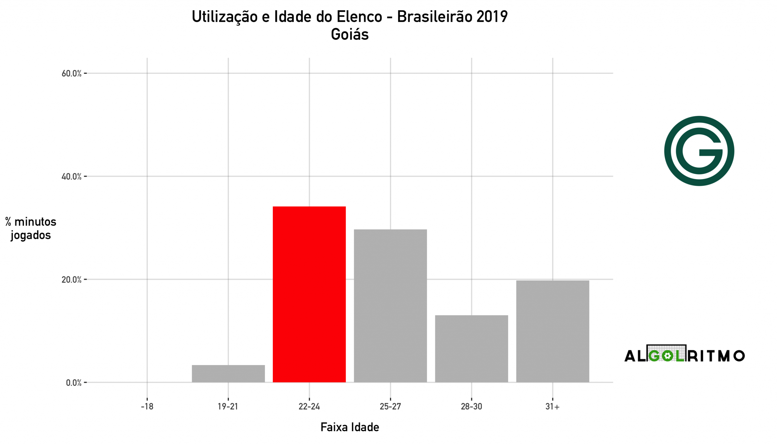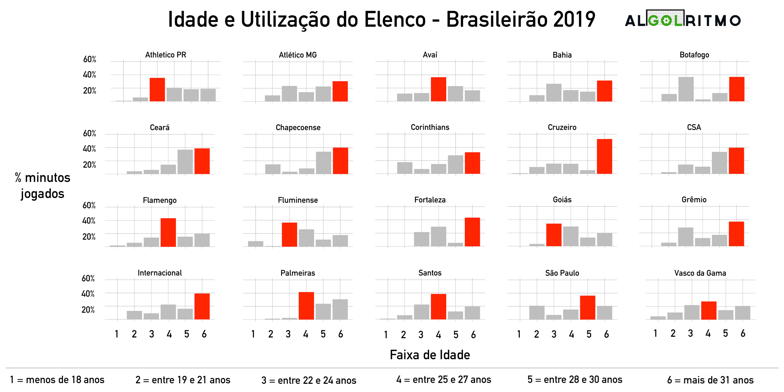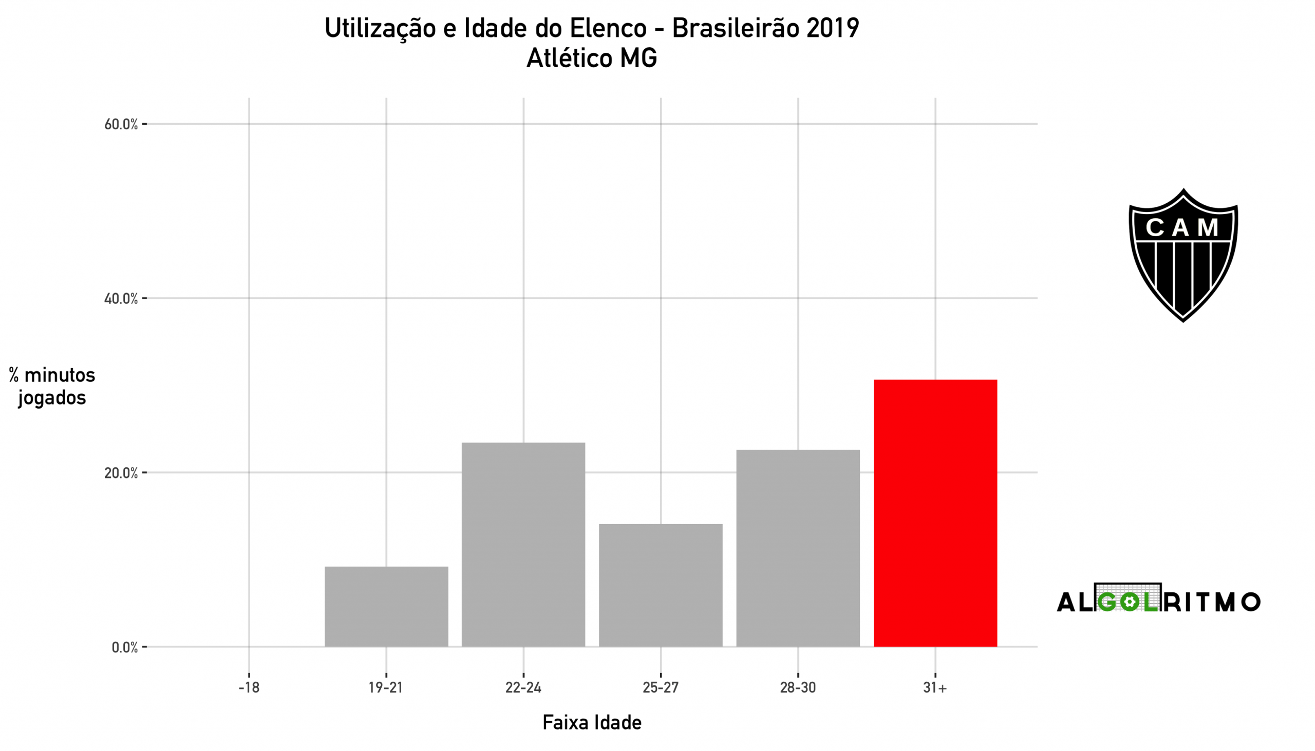 - Aqui o retrato do experiente Atlético, que escalou principalmente jogadores com mais de 30 anos no campeonato. A boa notícia é o número alto de minutos para jogadores de 22 a 24 anos.