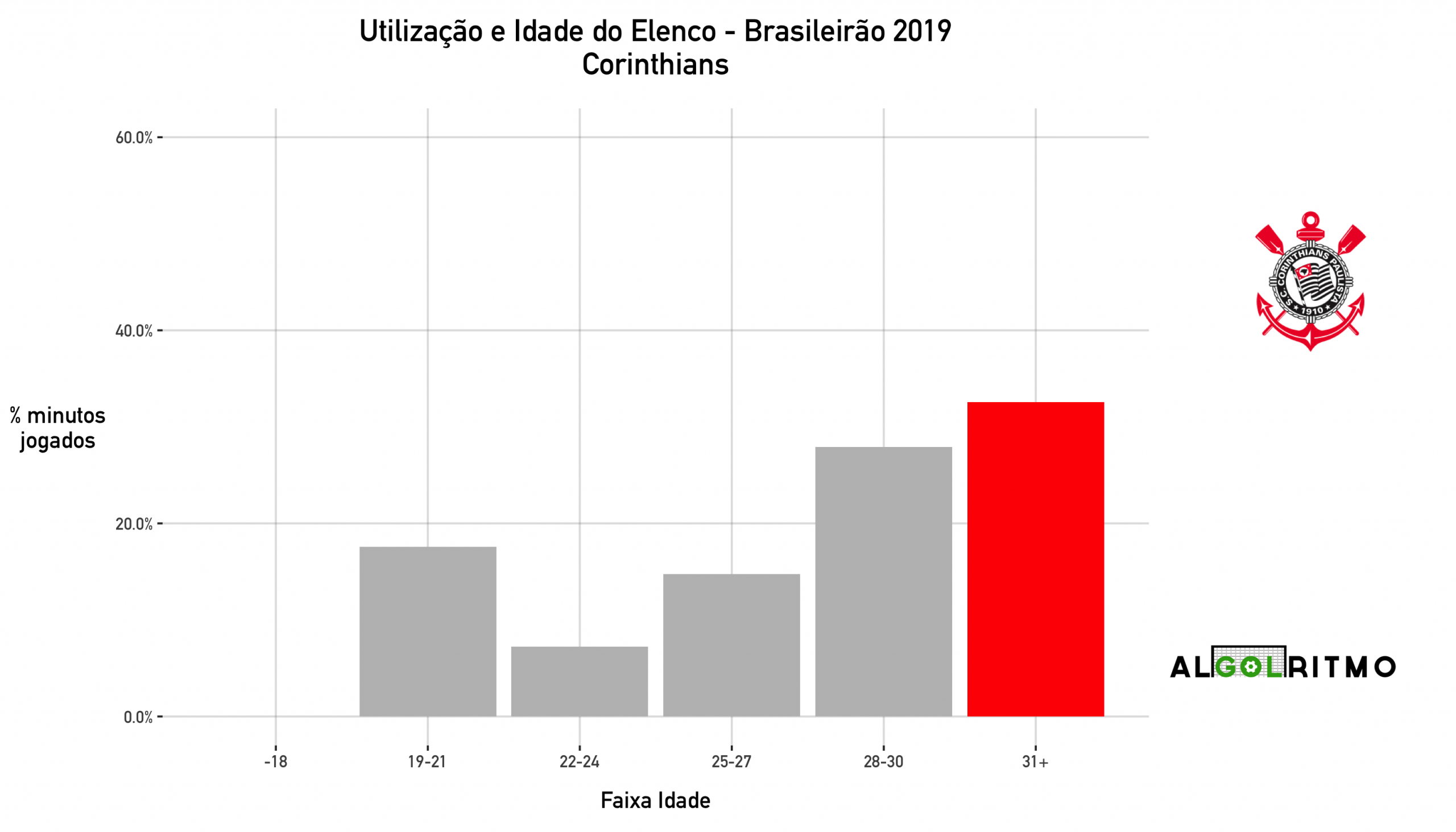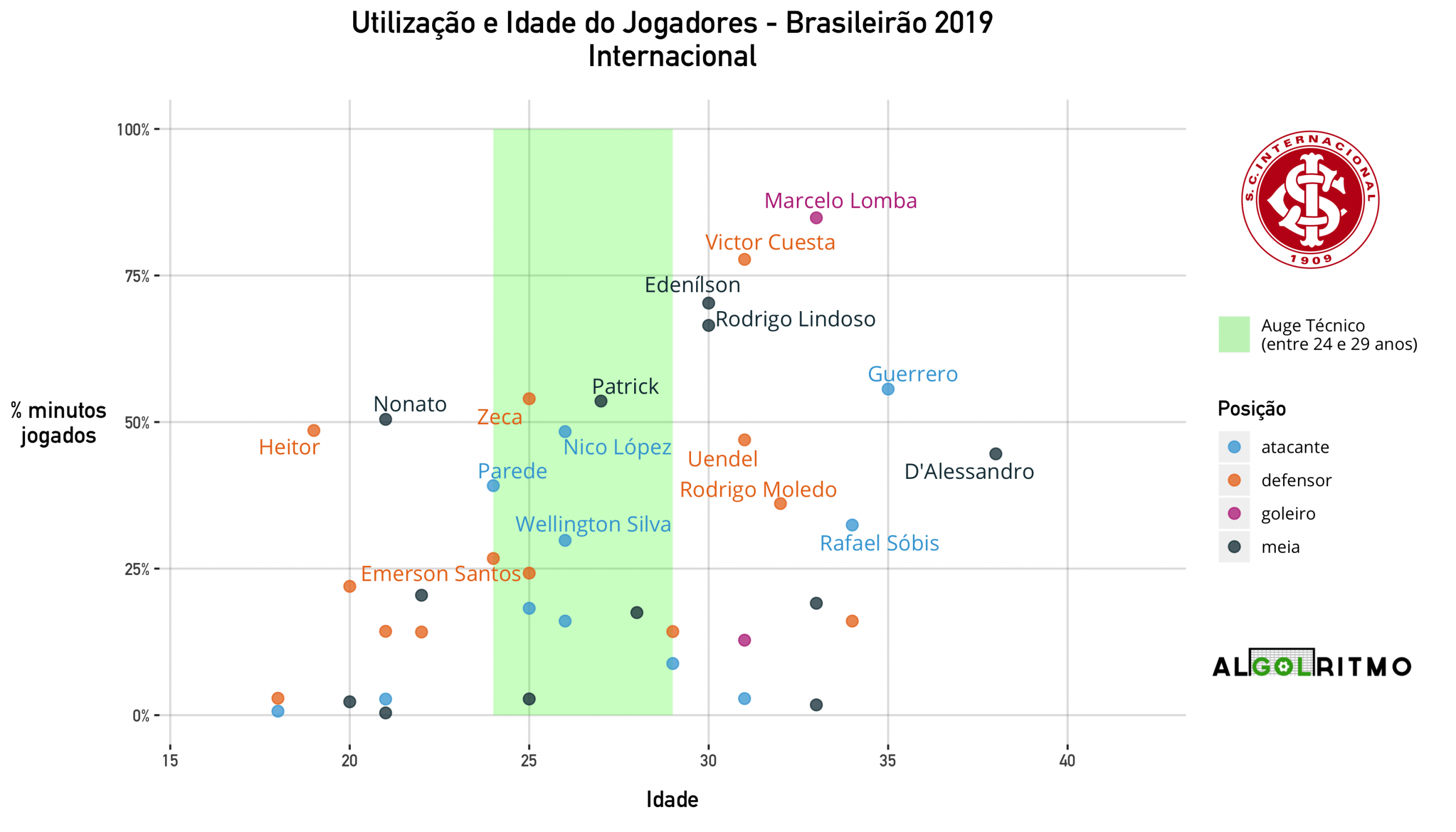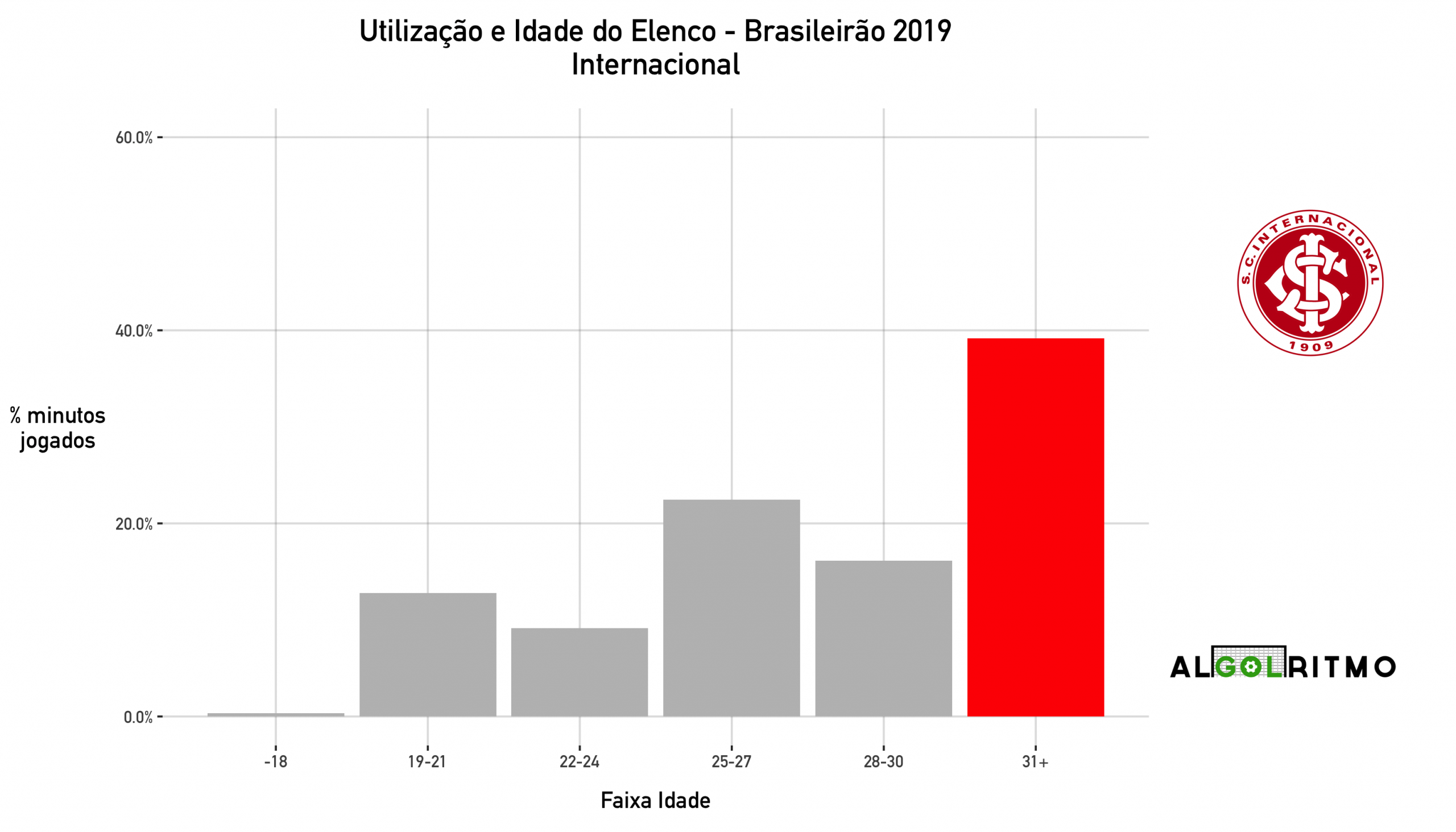 - O time do Internacional é mais velho (seguindo o padrão de vários outros clubes do BR19). Jogadores experientes foram importantes nesse ano, mas a tendência é ter um declínio no desempenho no futuro.