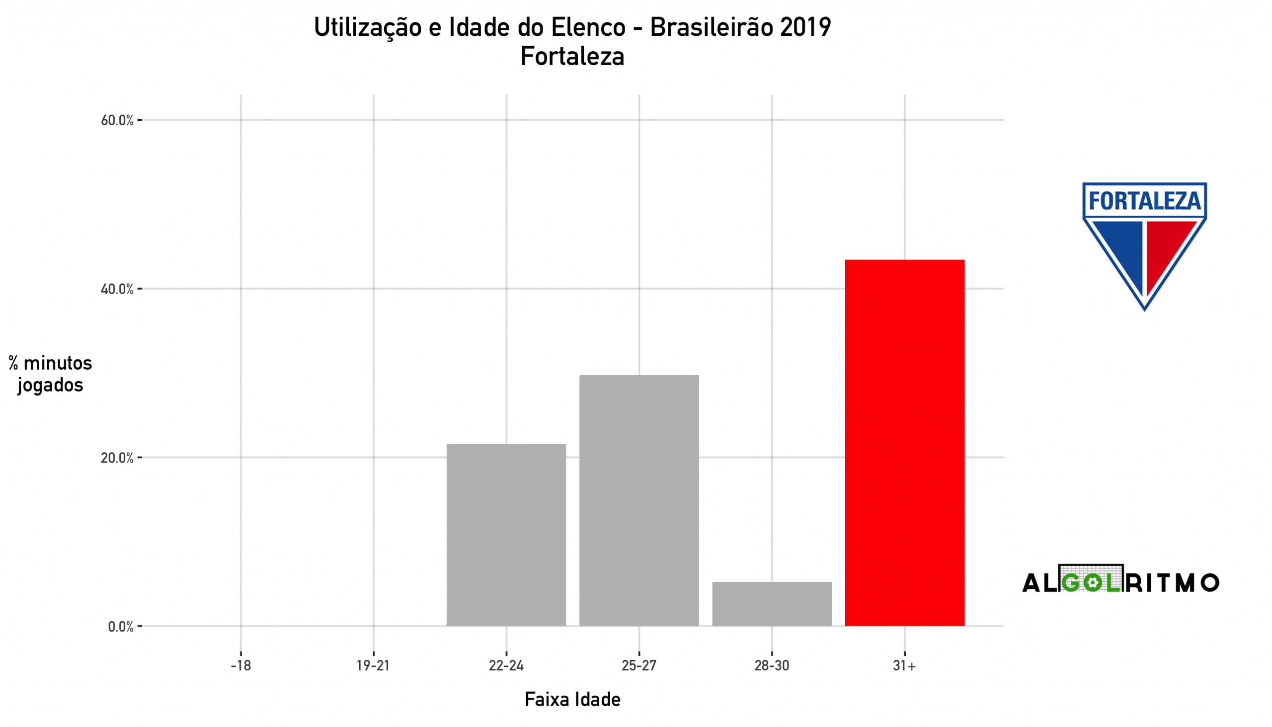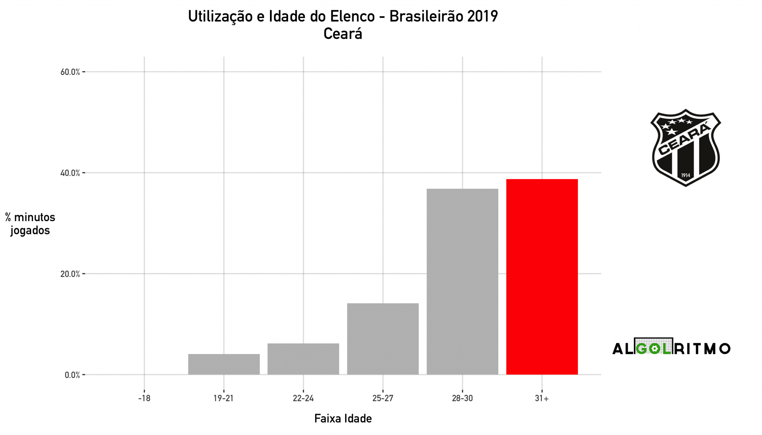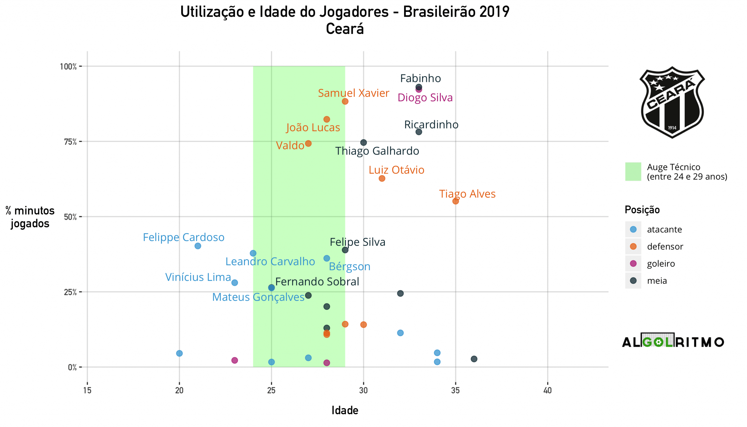 - O formato do gráfico do Ceará é preocupante, muitos minutos pra jogadores acima dos 28 anos e poucas oportunidades para mais jovens (que poderiam ajudar o time em campo ou em transferências).