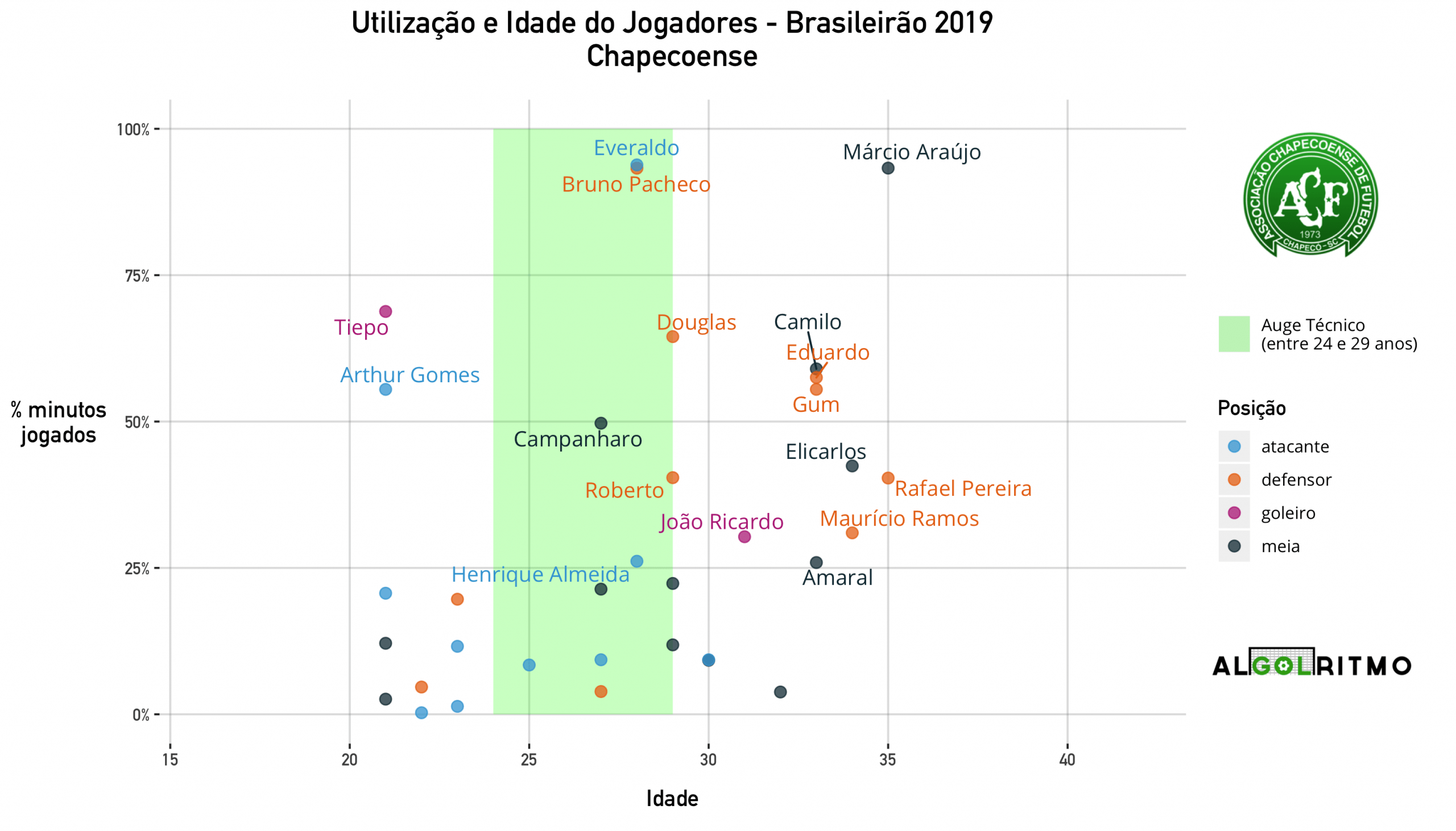 - A Chapecoense teve a maioria de seus jogadores longe do auge técnico. Principais apostas jovens (entre 19 e 21 anos) foram Tiepo e Artur Gomes