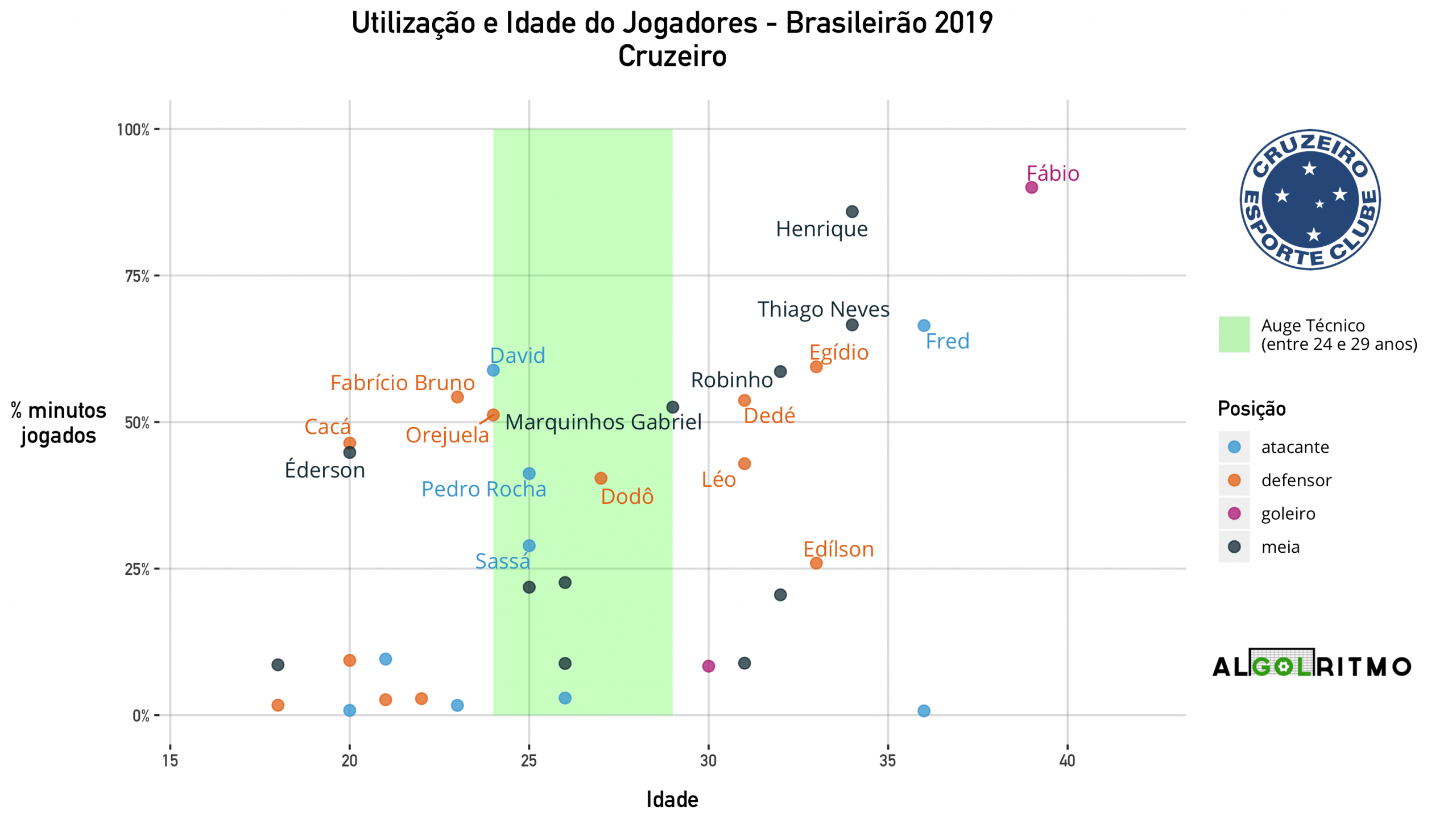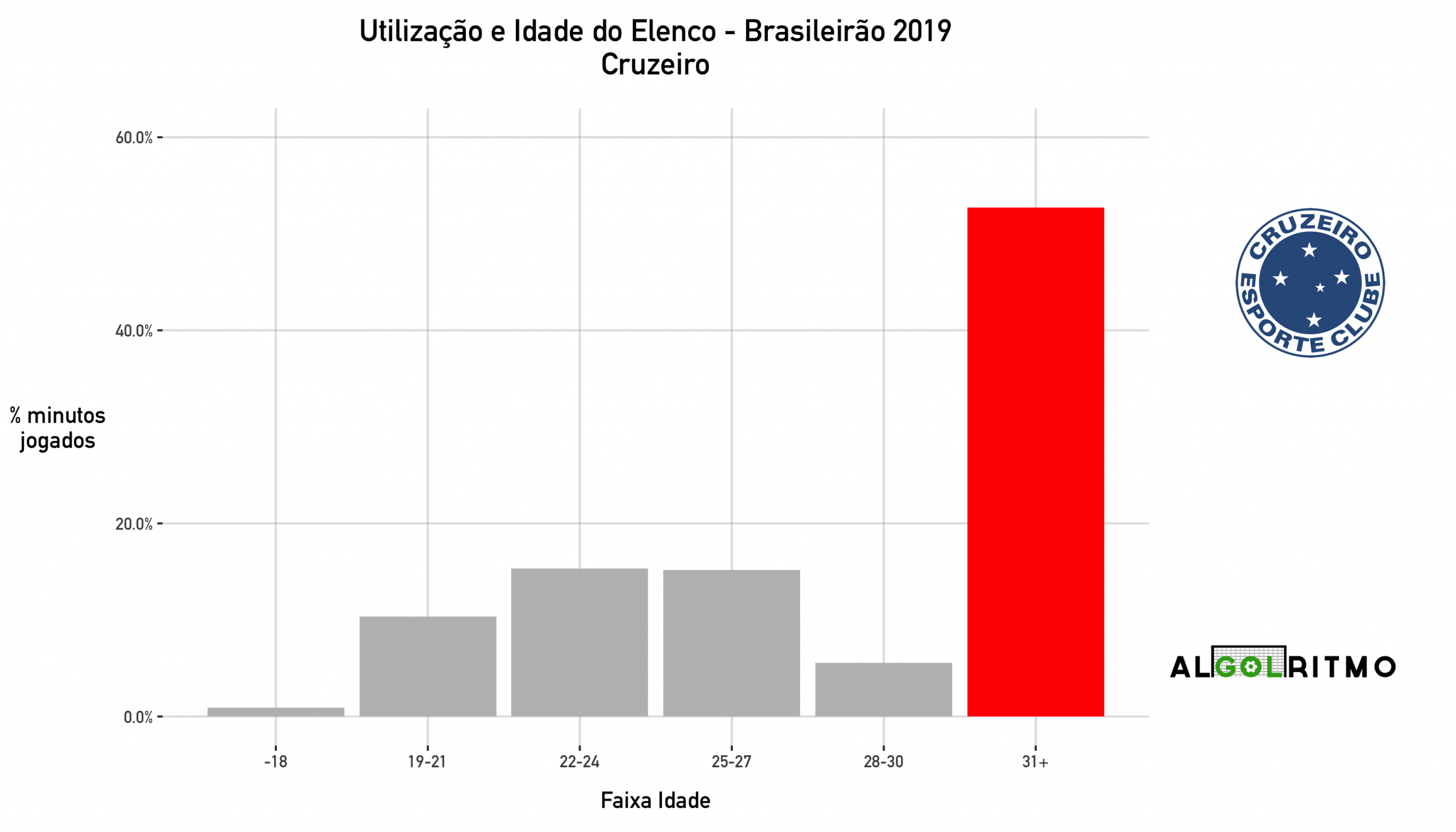 - Mais de 50% dos minutos do Cruzeiro foram ocupados por jogadores acima dos 30 anos. Baixíssima utilização de jogadores mais jovens.