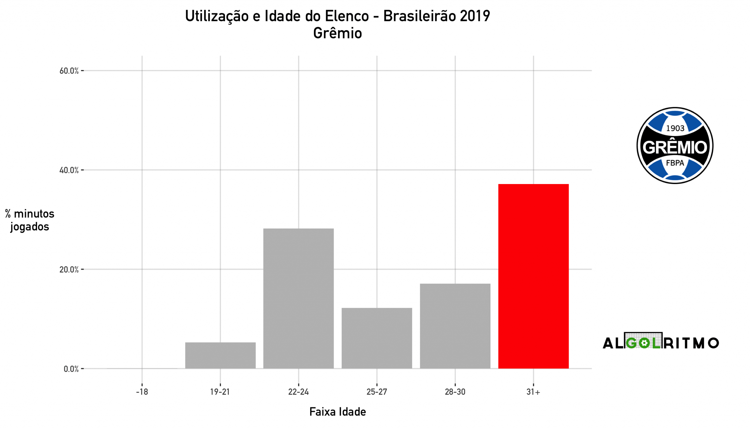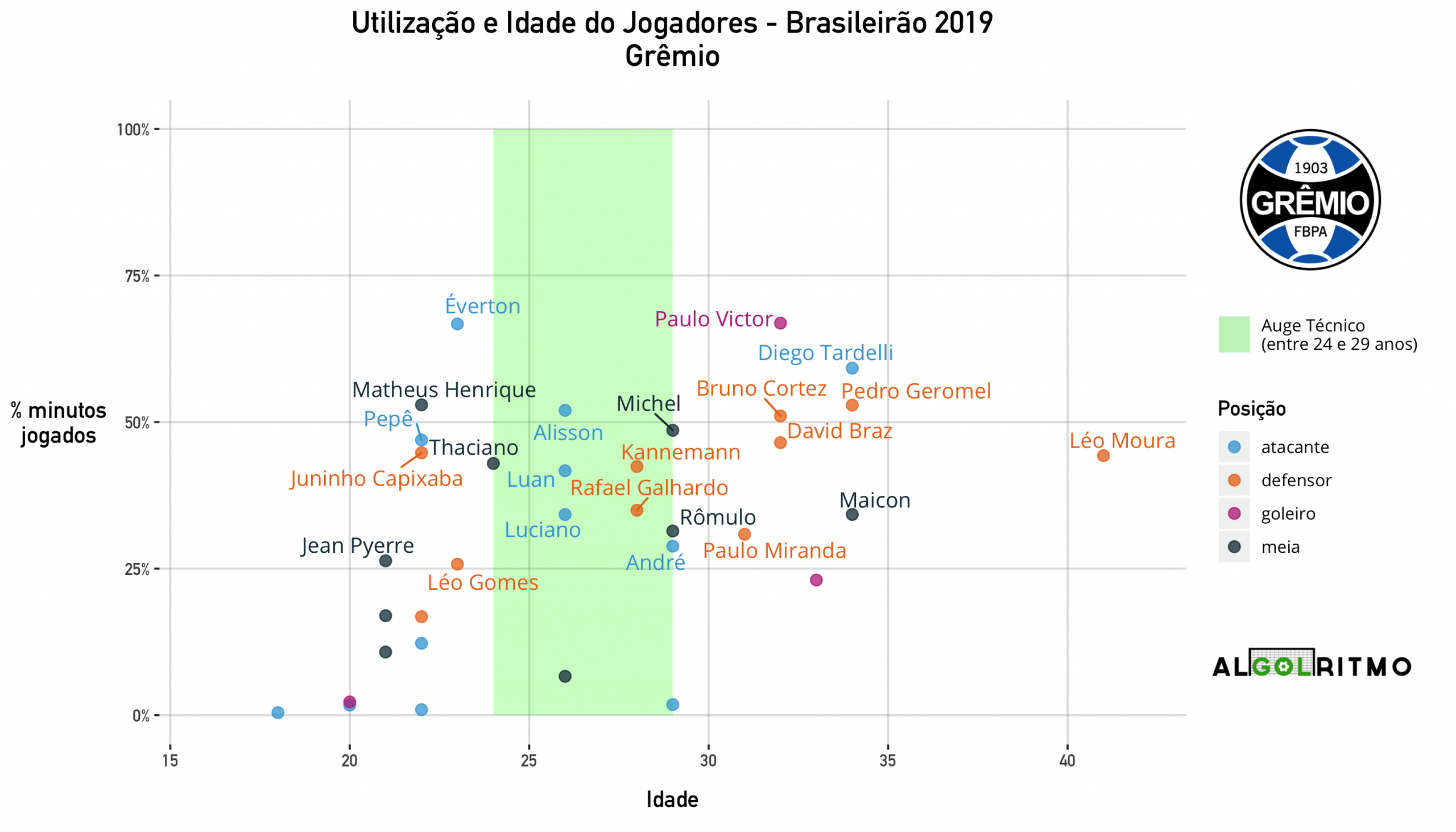 - No @Gremio utilizou muitos jogadores acima dos 30 anos, mas balanceou isso com minutos de jogadores entre 22 e 24 anos (Éverton, Matheus Henrique e Pepê principalmente).
