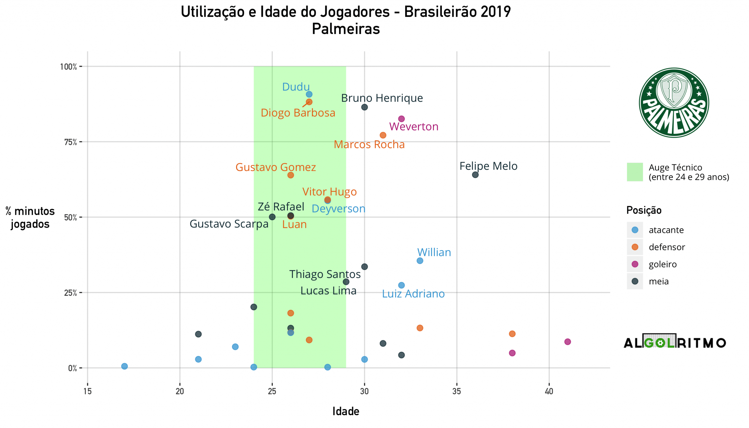 - O Palmeiras escala principalmente jogadores na casa dos 25 aos 27 anos. Os outros jogadores que participam de partidas do time estão acoma dos 31 anos. Nenhuma oportunidade para quem tem menos de 21.