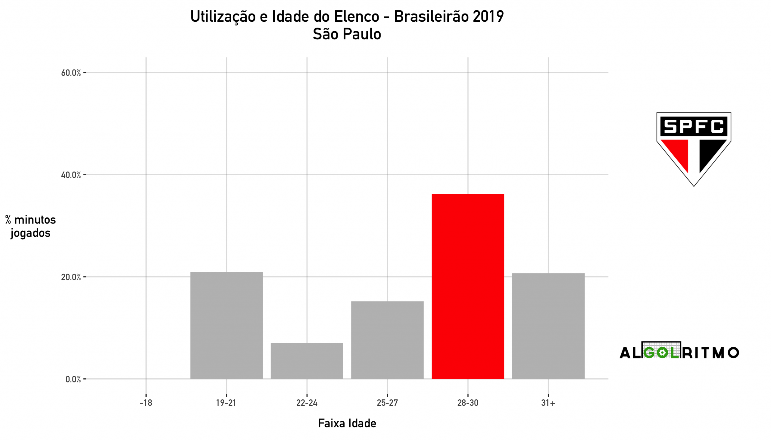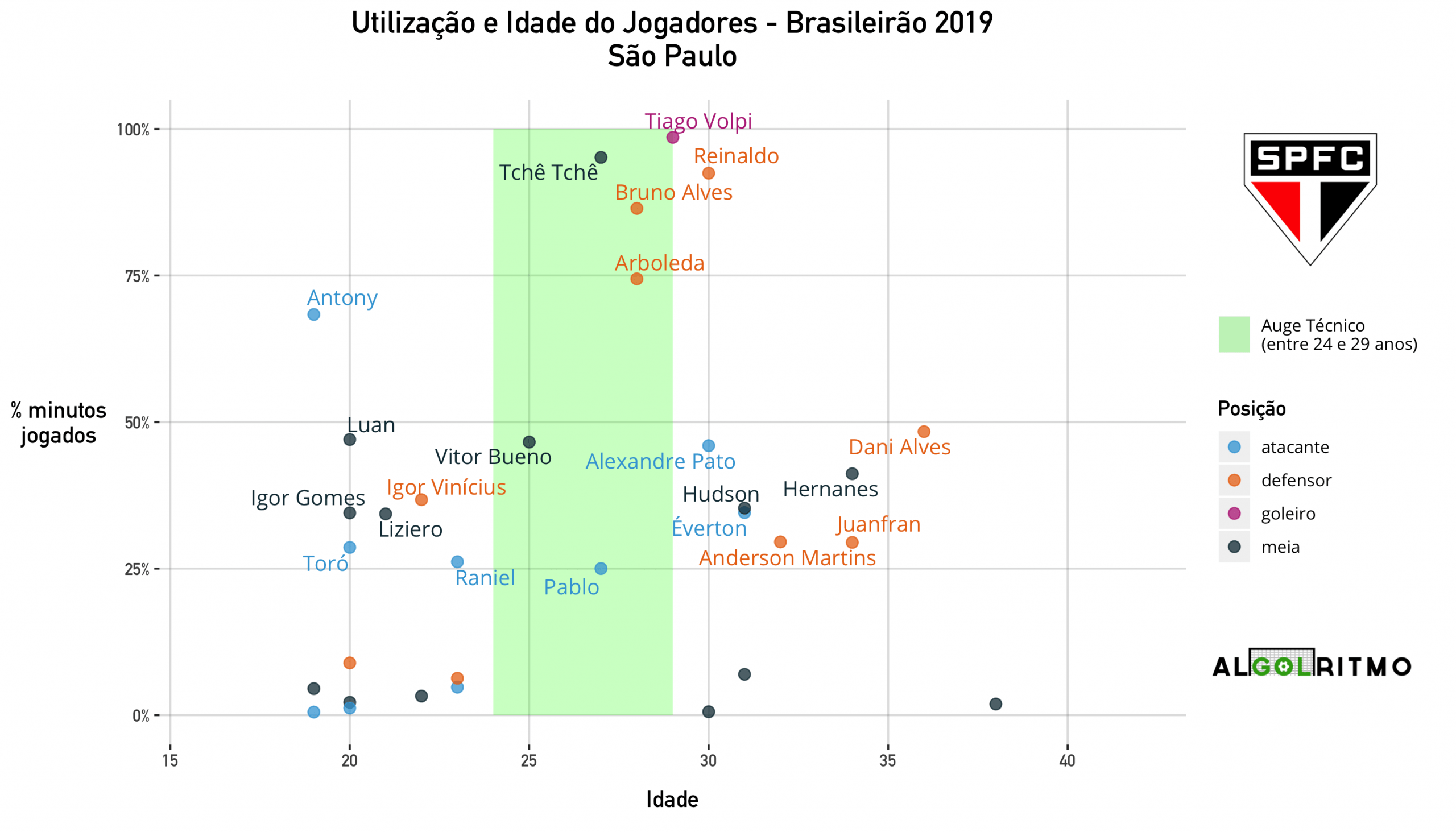 - O São Paulo escalou principalmente jogadores na faixa dos 19-21 anos. Time tem bons jogadores jovens, resta ver se serão aprovietados ou usados para gerar caixa e pagar os altos salários dos mais experientes.