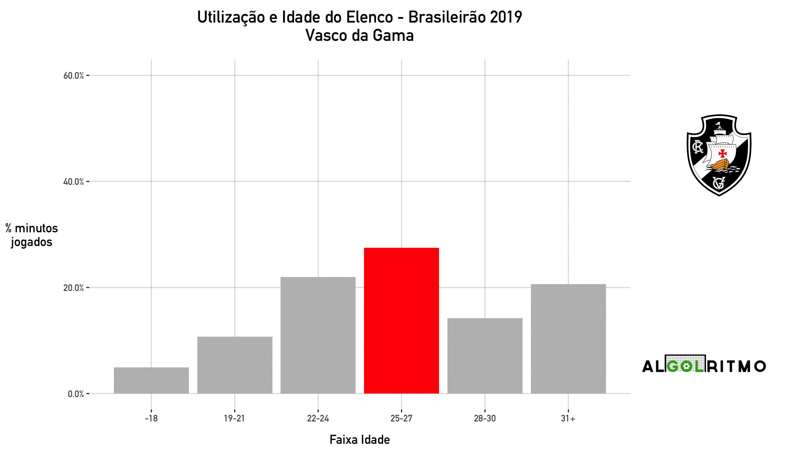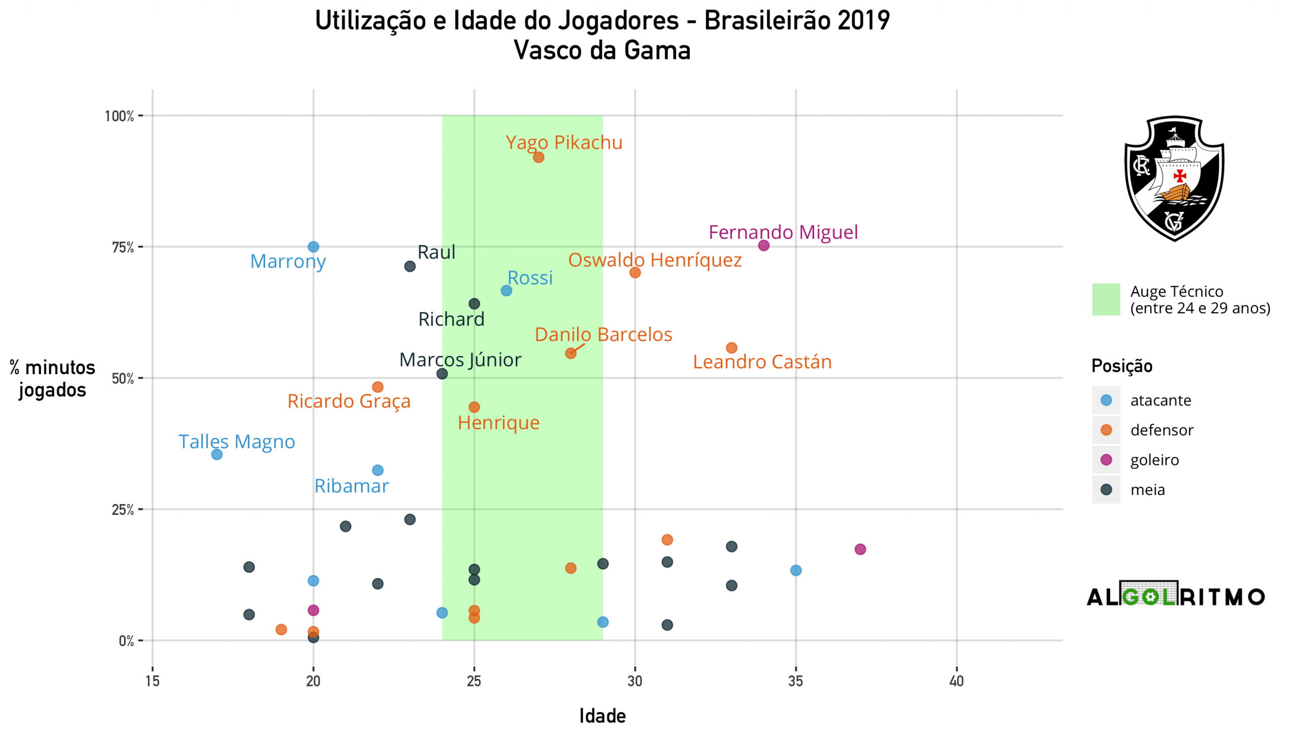 - O Vasco teve jogadores de diversas idades em campo. De forma geral, a defesa é mais experiente, o meio campo está na casa dos 25 anos e o ataque é bem jovem.